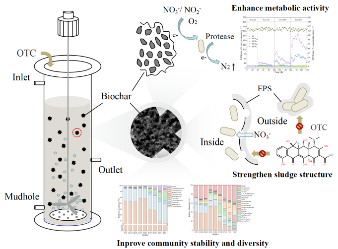 生物炭強化土霉素脅迫下好氧反硝化系統穩定性的主要機制模式圖