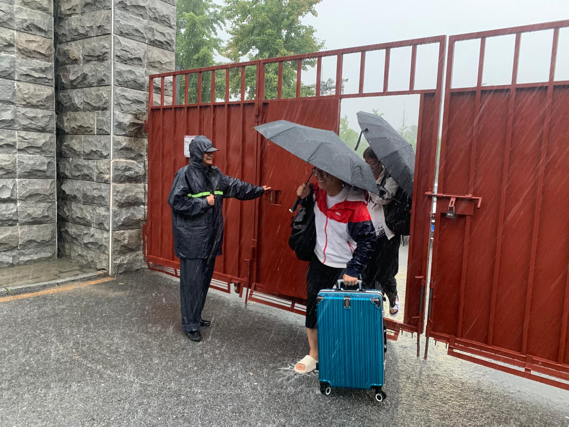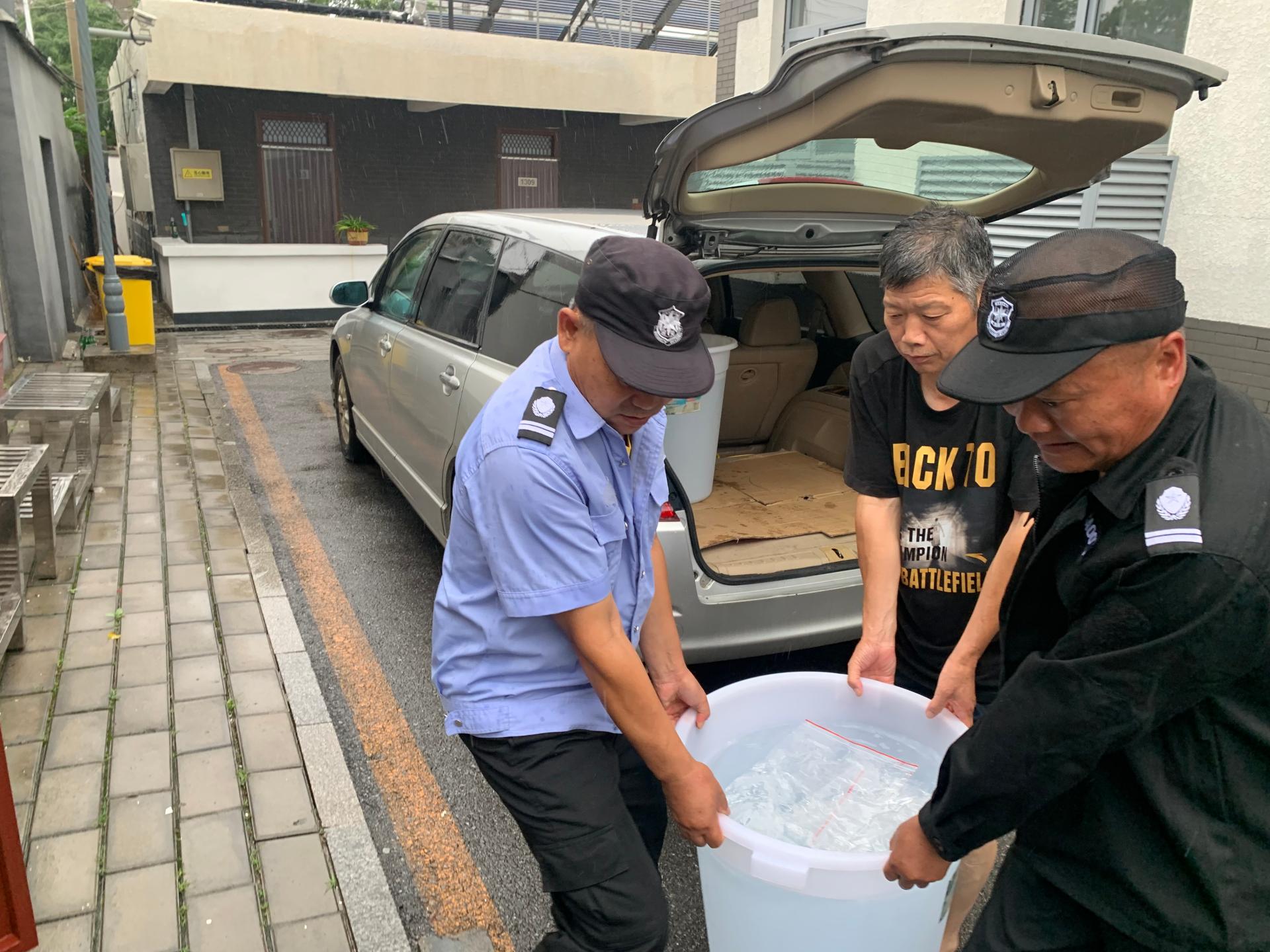 為保障師生飲食,在站司機郭聲凱和食堂師傅一起蹚過積水路段,冒雨將一筐筐食材轉運到車上拉回站內。在暴雨中,后勤物業中心保安師傅始終默默堅守崗位。除了嚴格門禁管理外,他們冒雨在站門口指引學生進站報到,搬運行李。每天早起晚睡,定時對基地進行全方位安全巡查,及時排除站內積水。