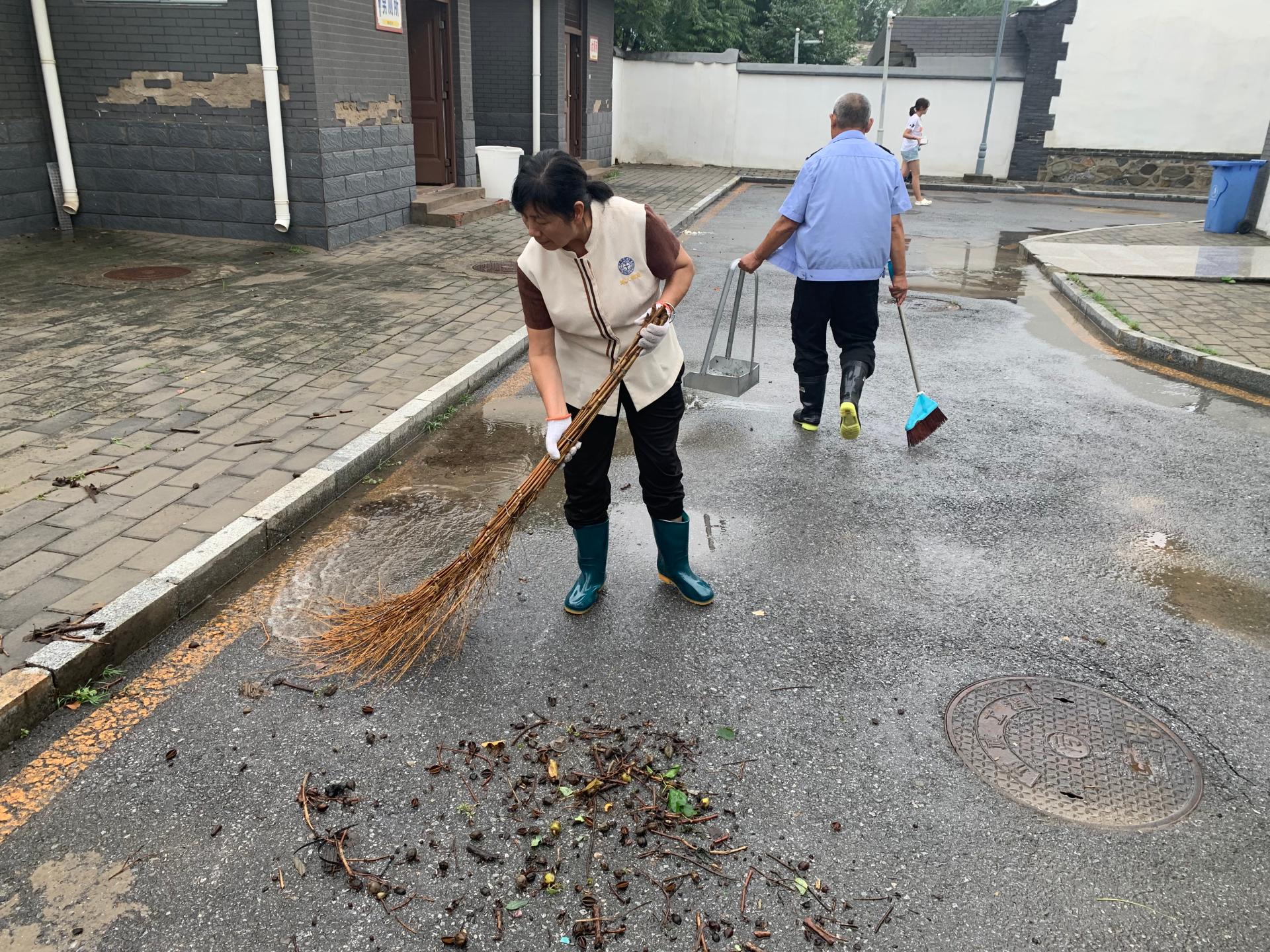 后勤員工在雨后打掃基地