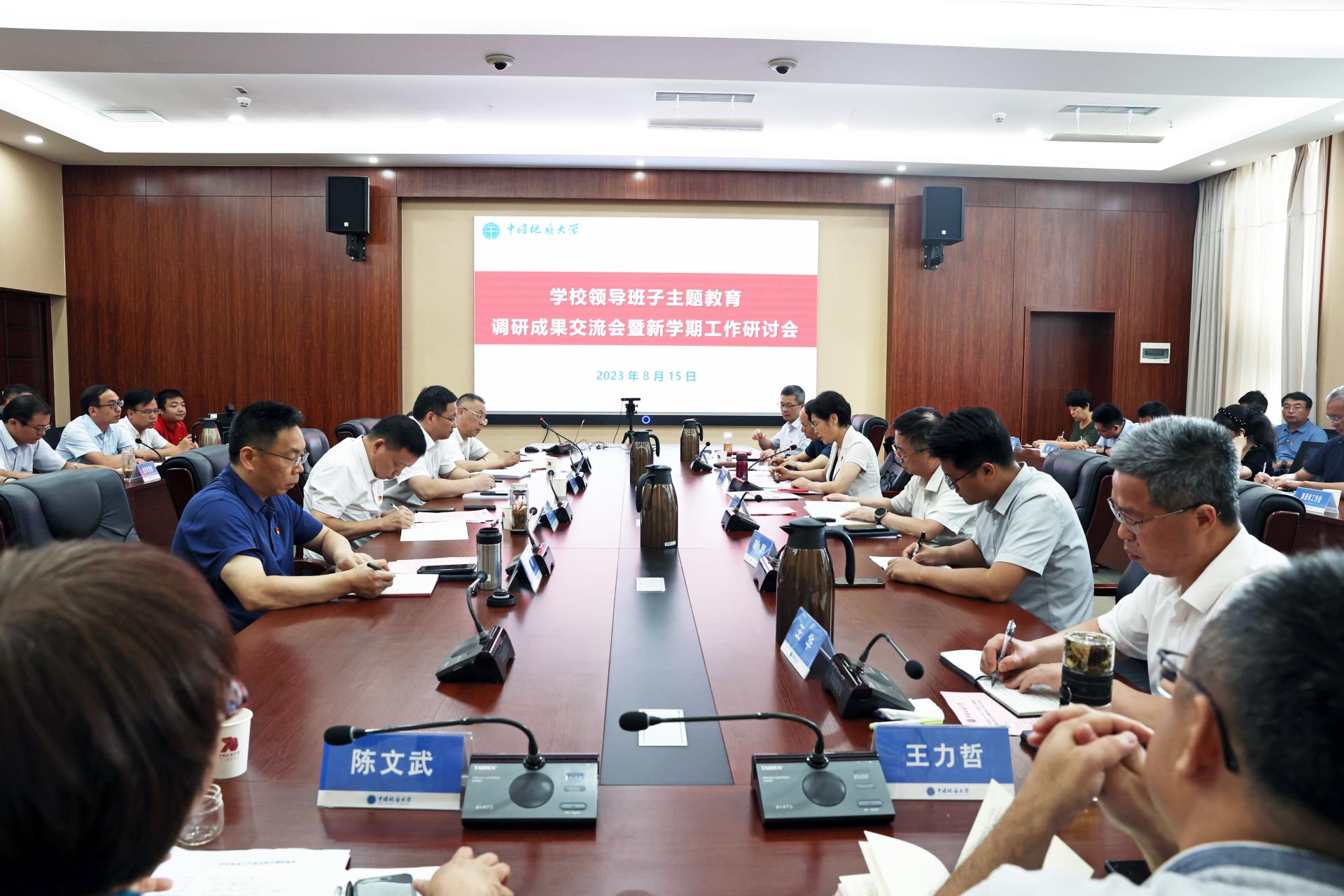 地大新聞網訊 (記者 孫彥欽)8月15日上午,學校領導班子在南望山校區東區教學綜合樓A701會議室召開學習貫徹習近平新時代中國特色社會主義思想主題教育調研成果交流會。教育部直屬高校主題教育第八巡回指導組副組長任應坤、指導組成員高鵬到會指導。校黨委書記黃曉玫主持會議。
