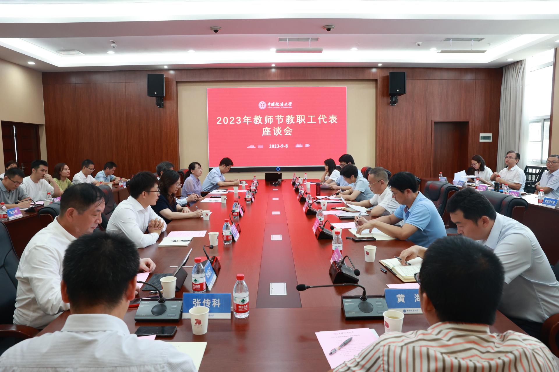 地大新聞網訊(通訊員 鄧錫琴 攝影 樊叢蓉)為慶祝全國第39個教師節,9月8日,學校召開2023年教師節教職工代表座談會,校黨委書記黃曉玫與來自各單位的20位教職工代表座談交流。校黨委副書記、紀委書記唐忠陽主持會議。
