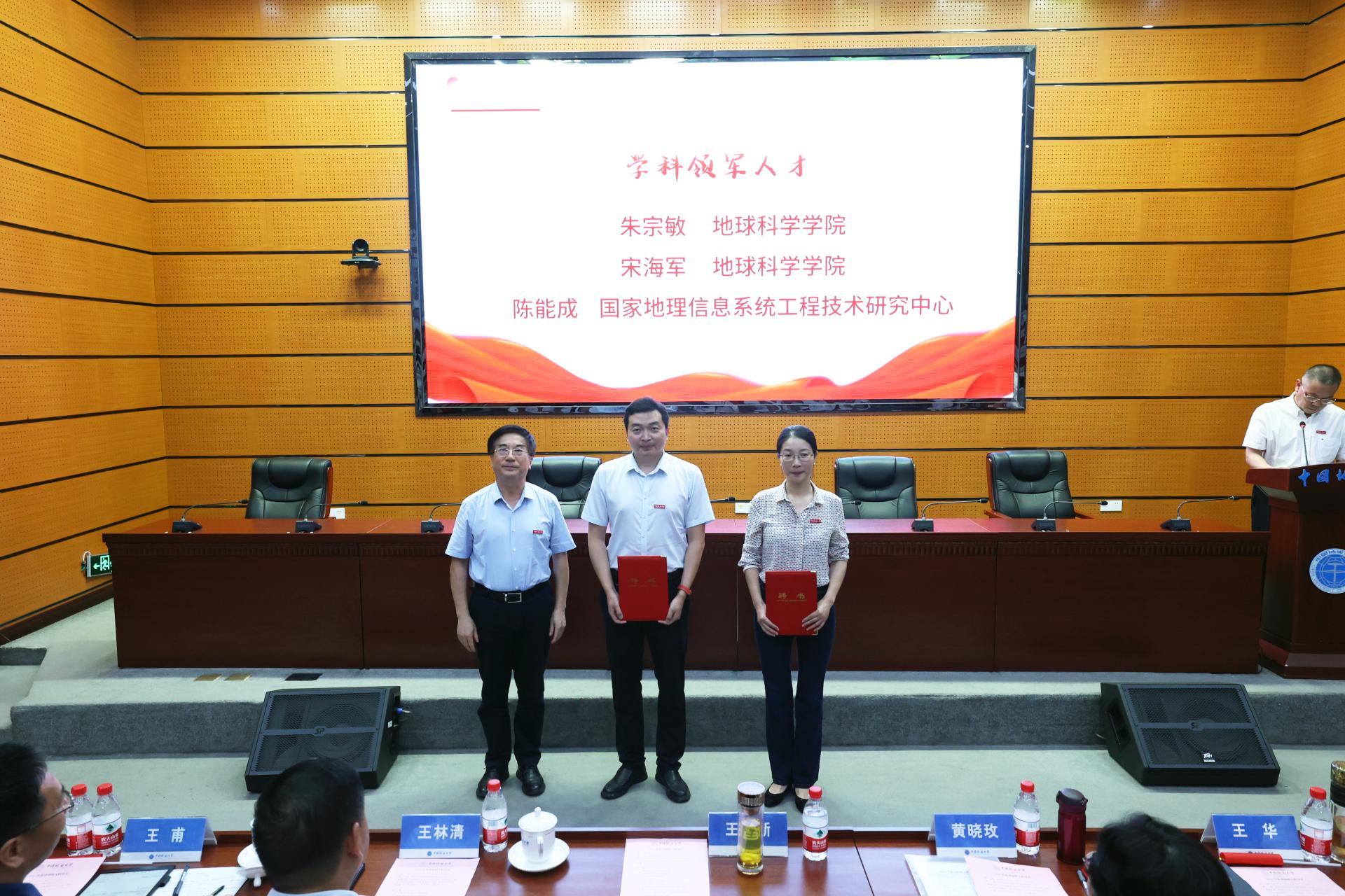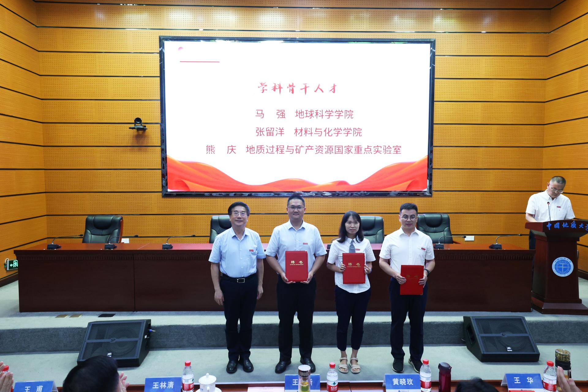 校長王焰新院士向地球科學(xué)學(xué)院朱宗敏和宋海軍、國家地理信息系統(tǒng)工程技術(shù)研究中心陳能成頒發(fā)“地大學(xué)者”學(xué)科領(lǐng)軍人才聘書;向地球科學(xué)學(xué)院馬強(qiáng)、材料與化學(xué)學(xué)院張留洋、地質(zhì)過程與礦產(chǎn)資源國家重點(diǎn)實(shí)驗(yàn)室熊慶頒發(fā)“地大學(xué)者”學(xué)科骨干人才聘書。