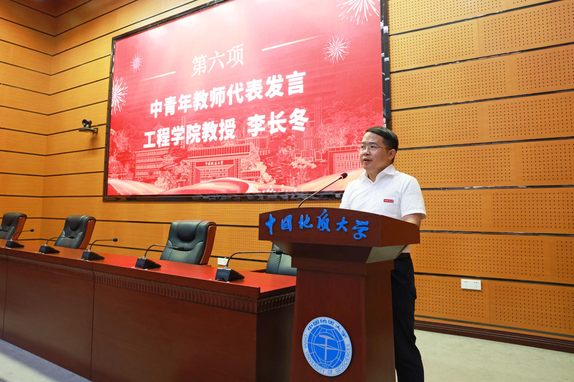 工程學(xué)院教授李長冬作為中青年教師代表發(fā)言。他深情講述了自己在地大20多年的學(xué)習(xí)和生活歲月,并表達(dá)了對新進(jìn)教師未來發(fā)展的美好祝福。