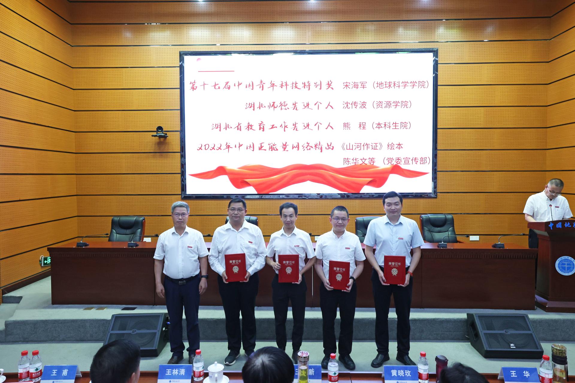 副校長王華為“第十七屆中國青年科技特別獎(jiǎng)”獲得者宋海軍、“湖北師德先進(jìn)個(gè)人”獲得者沈傳波、“湖北省教育工作先進(jìn)個(gè)人”獲得者熊程、“中國正能量網(wǎng)絡(luò)精品”繪本《山河作證》創(chuàng)作者陳華文頒發(fā)榮譽(yù)證書。