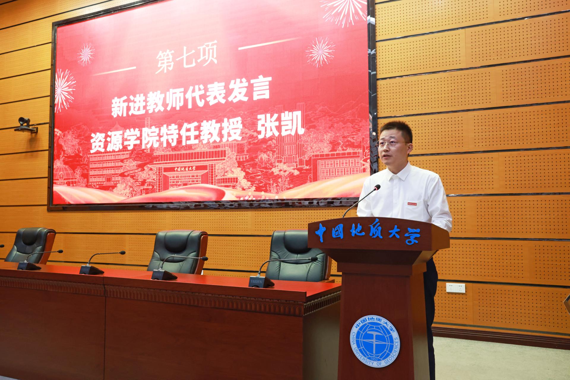 資源學(xué)院特任教授張凱作為新進(jìn)教師代表發(fā)言。他分享了對地大“艱苦樸素、求真務(wù)實(shí)”校訓(xùn)精神和地大人“堅(jiān)守初心,仰望未來”豪邁情懷的感想體會。