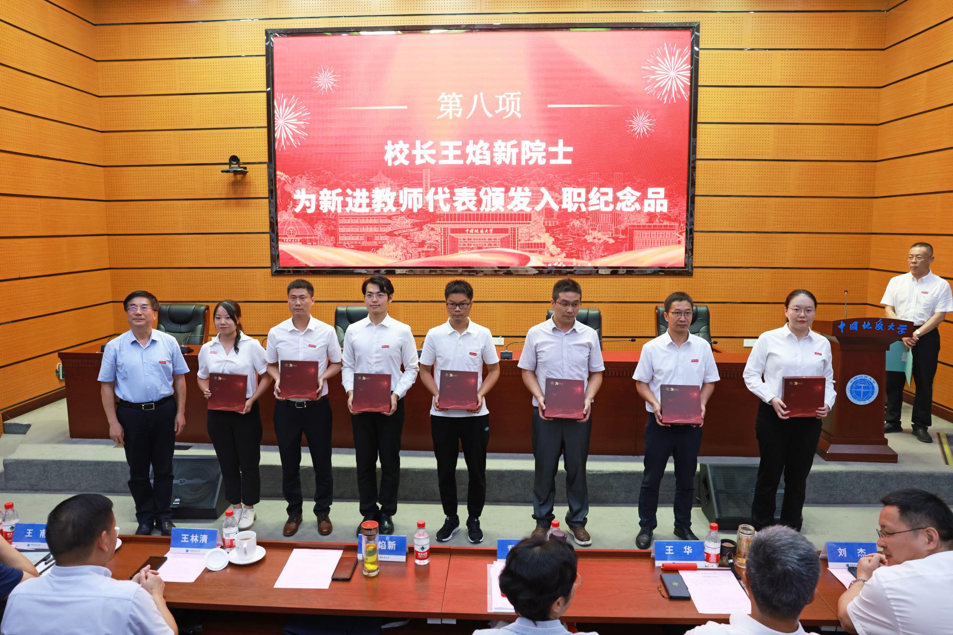 王焰新為新進(jìn)教師代表頒發(fā)校徽及入職紀(jì)念品。