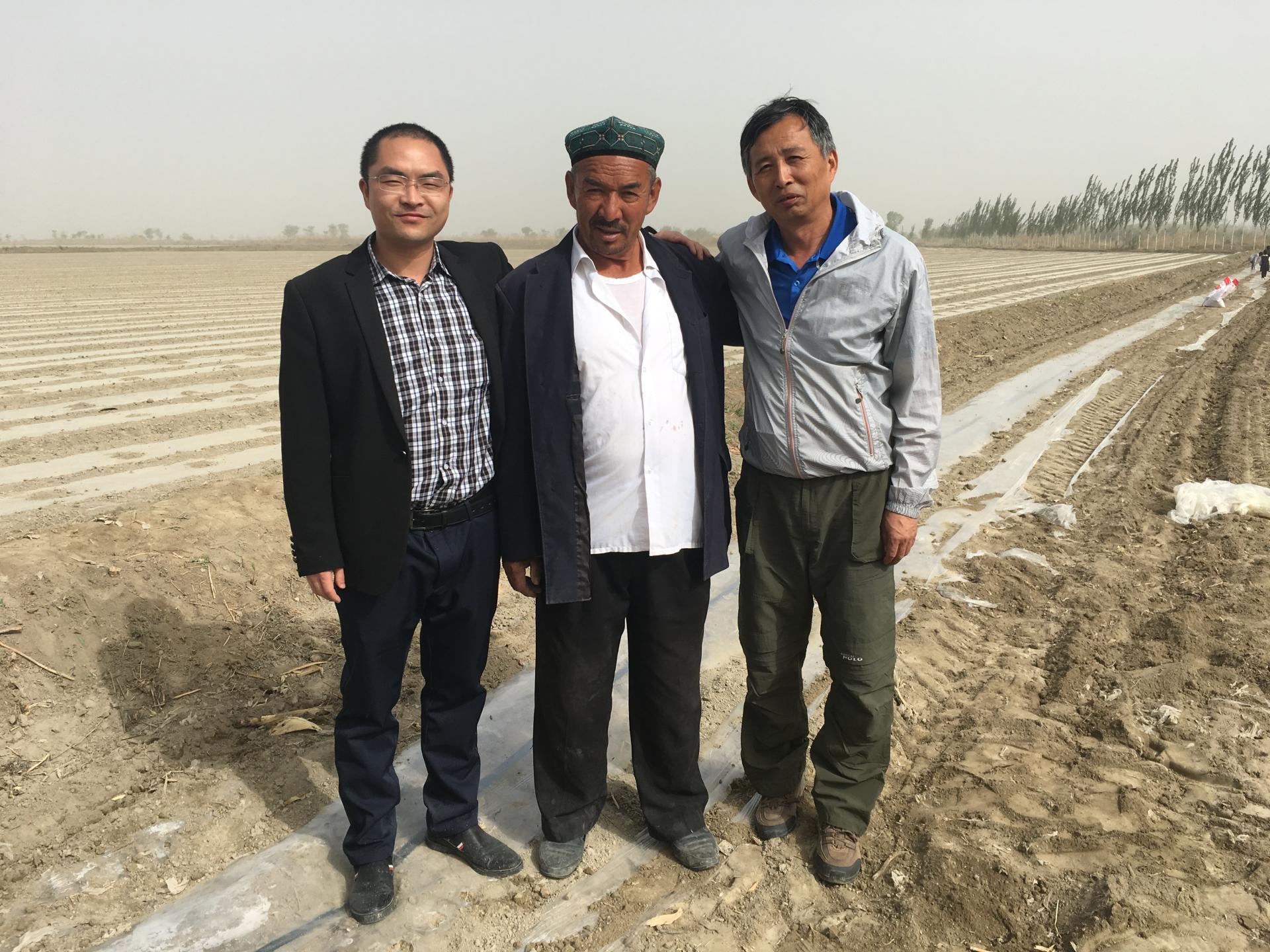 2018年4月,洪軍(左一)參與“民族團結一家親”活動,到田間地頭看望維吾爾族結對親戚。