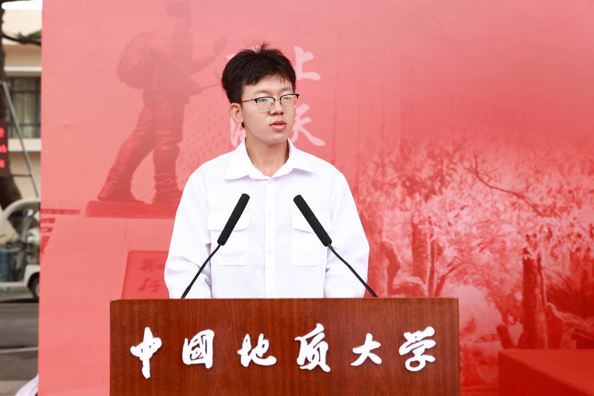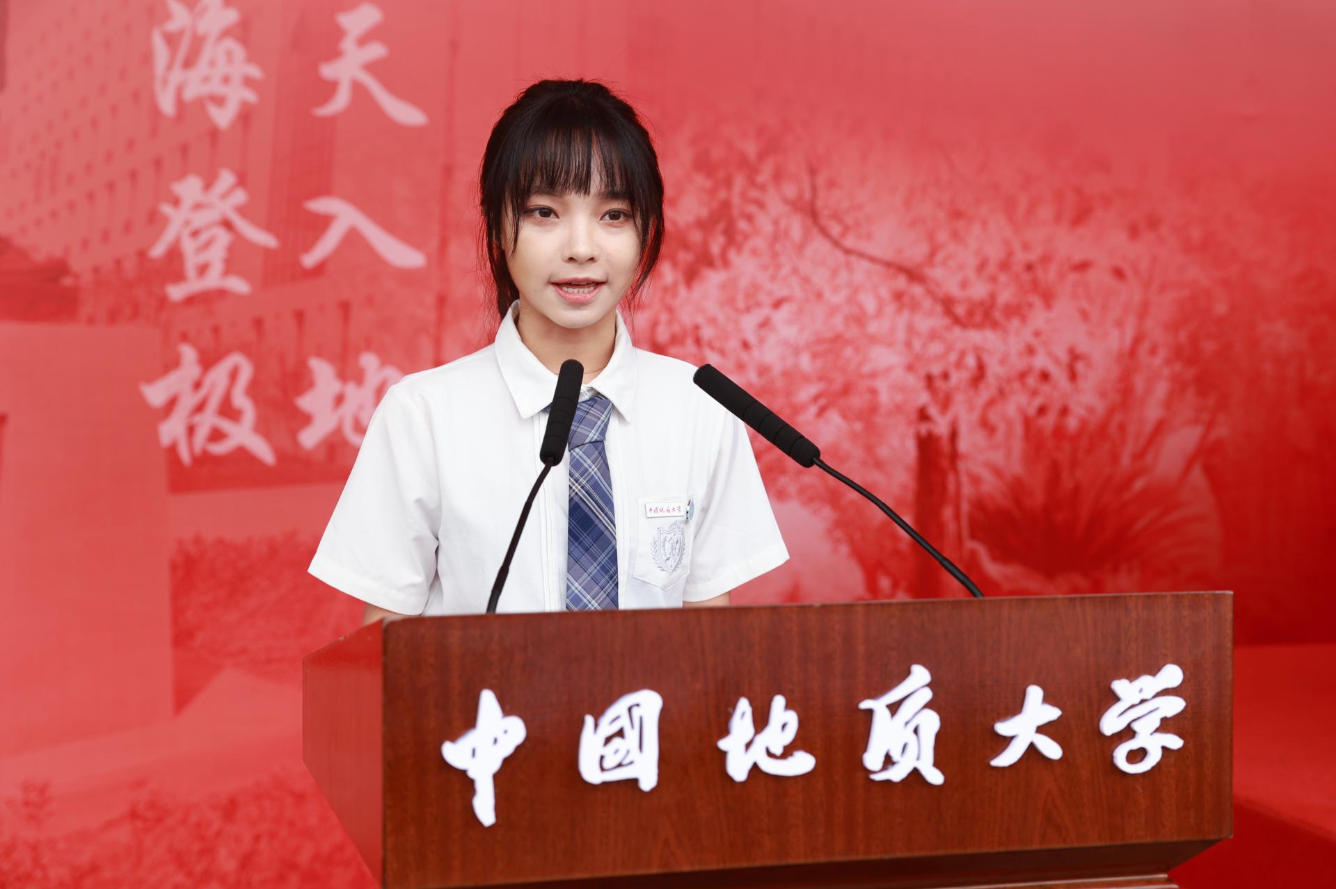 高年級學生代表、經濟管理學院2021級本科生謝馨儀分享了她在地大求學的故事,鼓勵新生不要羞于當“卷王”,努力奮斗,保持熱愛,勇敢追逐自己的夢想,發出自己耀眼的光芒。她表示,地大這片熱土,將會是大家筑夢的起點、追夢的支點、并最終指引大家到達圓夢的終點。
