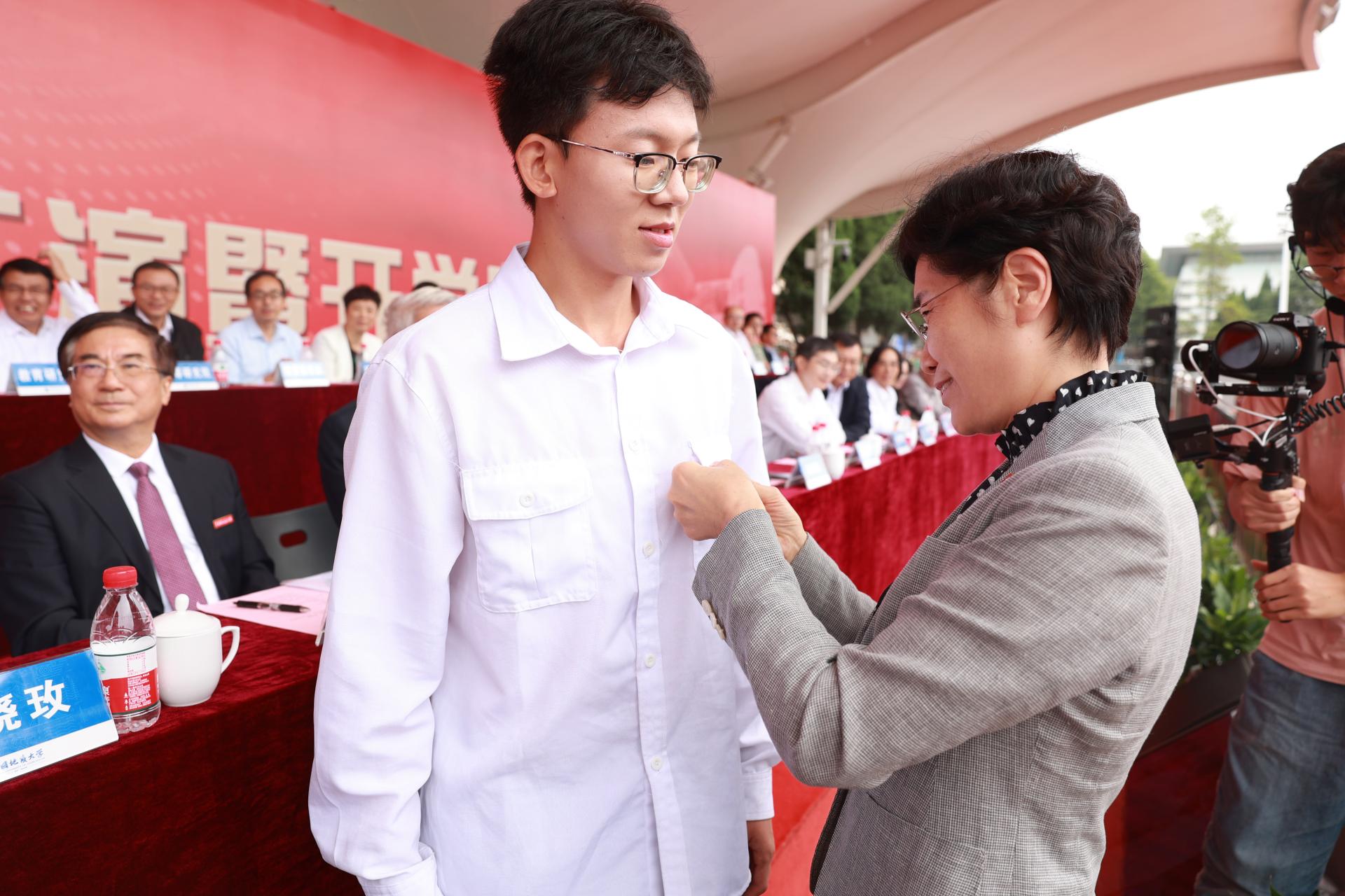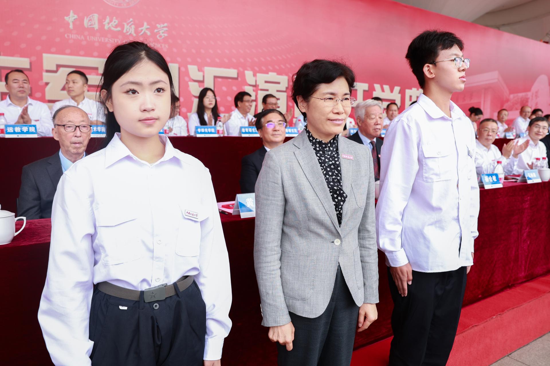 校黨委書記黃曉玫為本科新生代表佩戴校標。全體本科新生佩戴中國地質大學校標,成為光榮的地大人。
