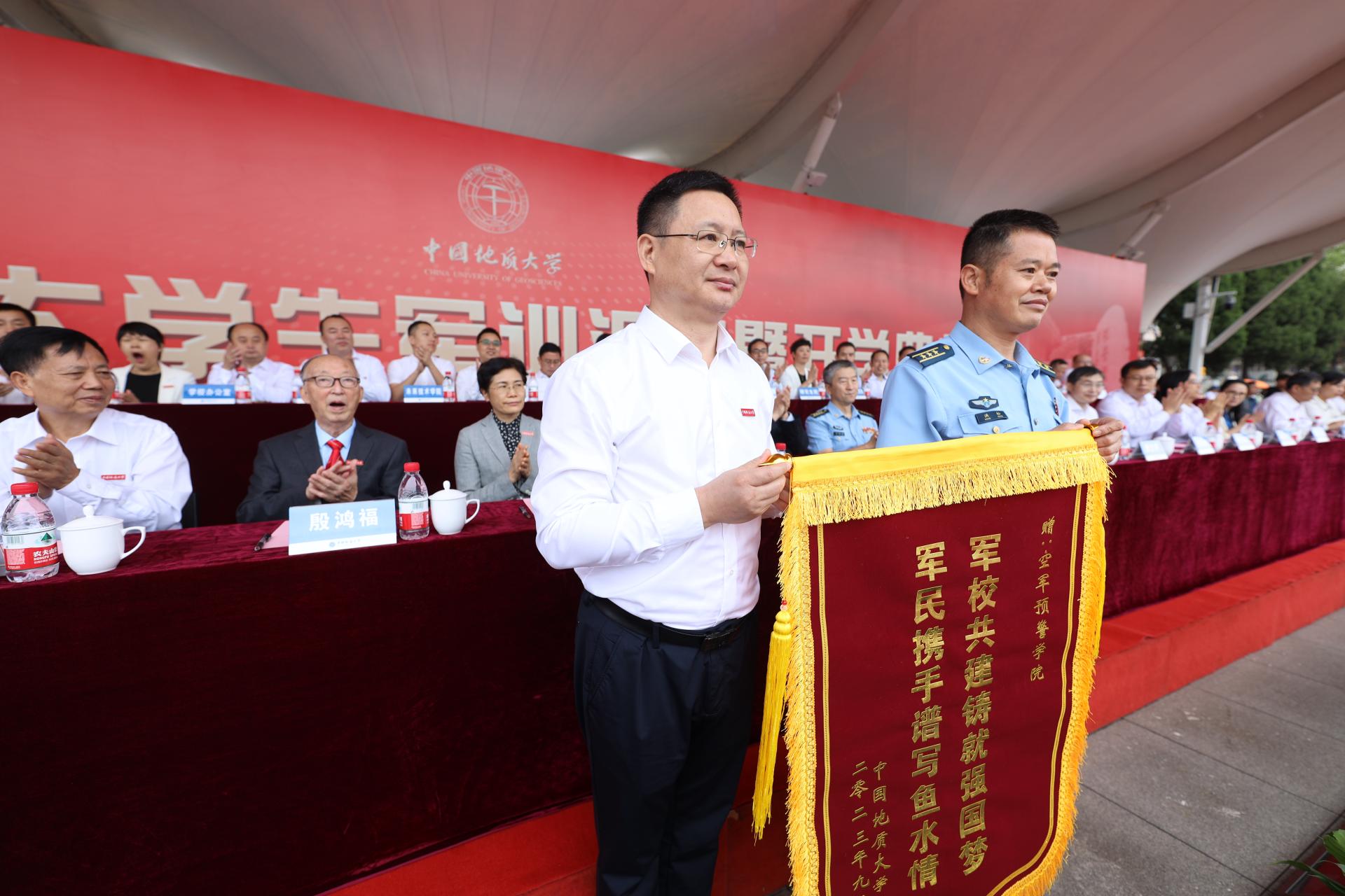 地大新聞網訊(記者 王俊芳 孫彥欽)9月24日,中國地質大學(武漢)2023級大學生軍訓匯演暨開學典禮在南望山校區西區操場舉行。校黨委書記黃曉玫,中國科學院院士、校長王焰新,中國科學院院士殷鴻福、金振民,教育部直屬高校黨建工作聯絡員謝守成,空軍預警學院副院長兼教育長孫合敏大校,空軍預警學院學員一大隊大隊長洪松上校,黨委副書記王林清,副校長劉杰,黨委副書記、紀委書記唐忠陽,副校長李建威,黨委常委、黨委組織部部長、統戰部部長陳文武,教師代表、學生代表,各教學科研機構、管理服務機構負責人,輔導員及2023級全體本科新生參加典禮。