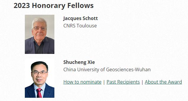 美國地質學會網頁截圖,謝樹成院士、法國地質學家雅克·肖特(Jacques Schott)教授當選2023年GSA榮譽會士