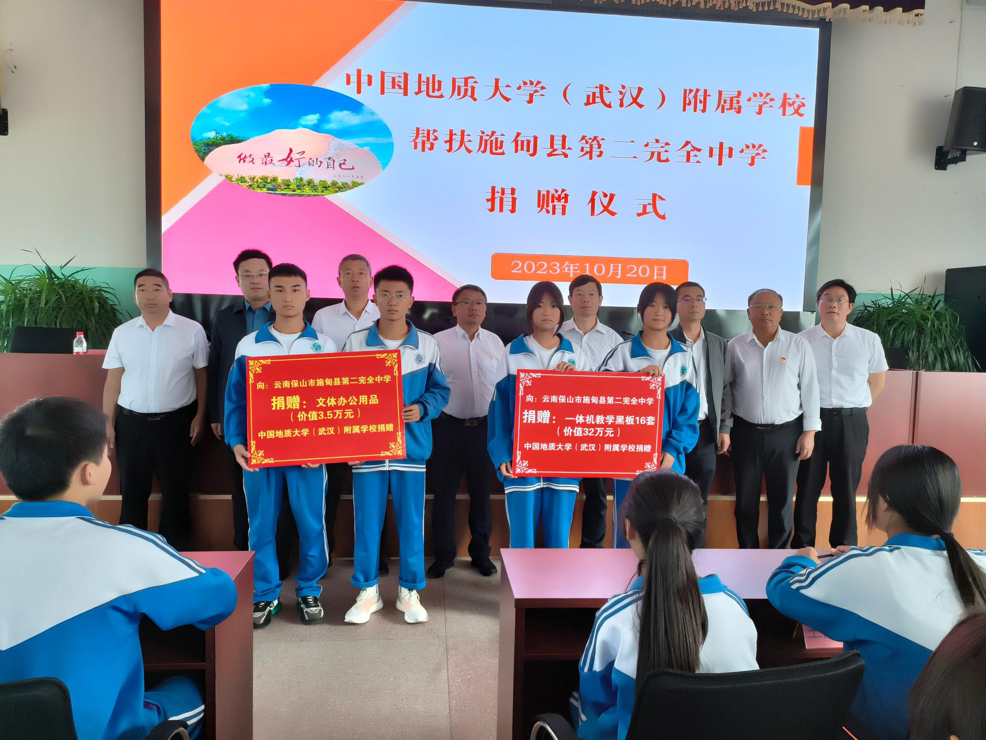 下午,在施甸二中會議室舉行了捐贈儀式。地大附屬學(xué)校向施甸二中捐贈了16套價值32萬元的一體機黑板和價值3.5萬元的文體辦公用品。黎義波在捐贈儀式上深情地說:“從黃鶴故鄉(xiāng)到彩云之南,山高路遠阻斷不了兩校交流腳步。我們在共鳴中牽手,在交流中進步,用實際行動推進教育同均衡,城鄉(xiāng)共發(fā)展。”