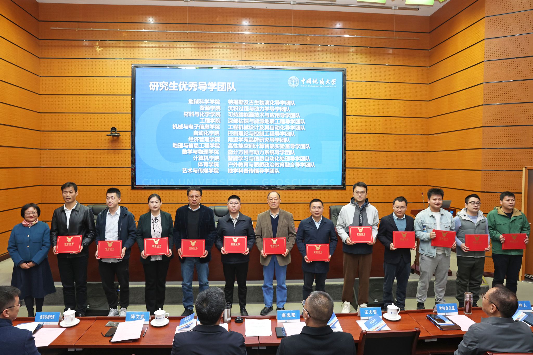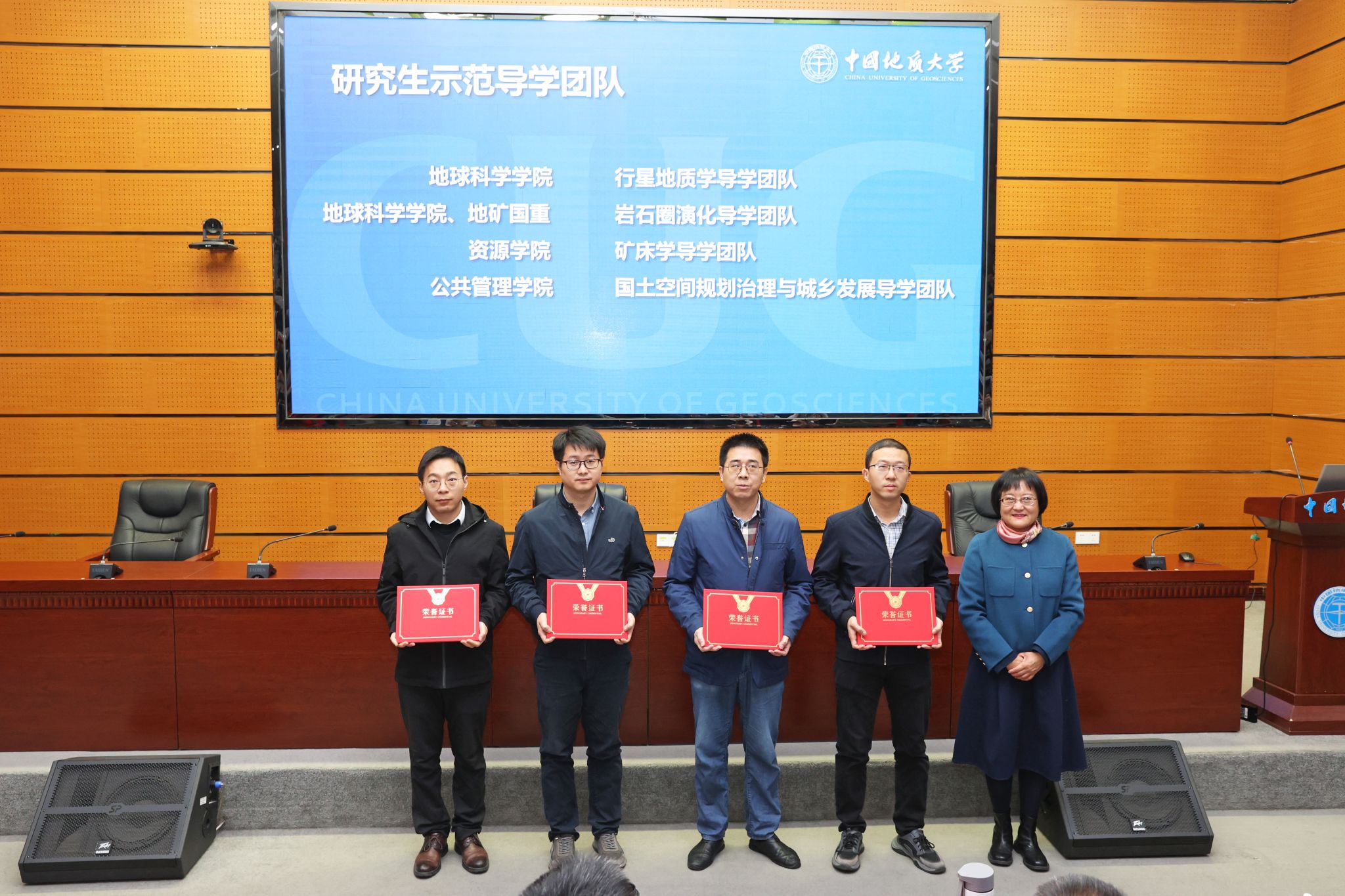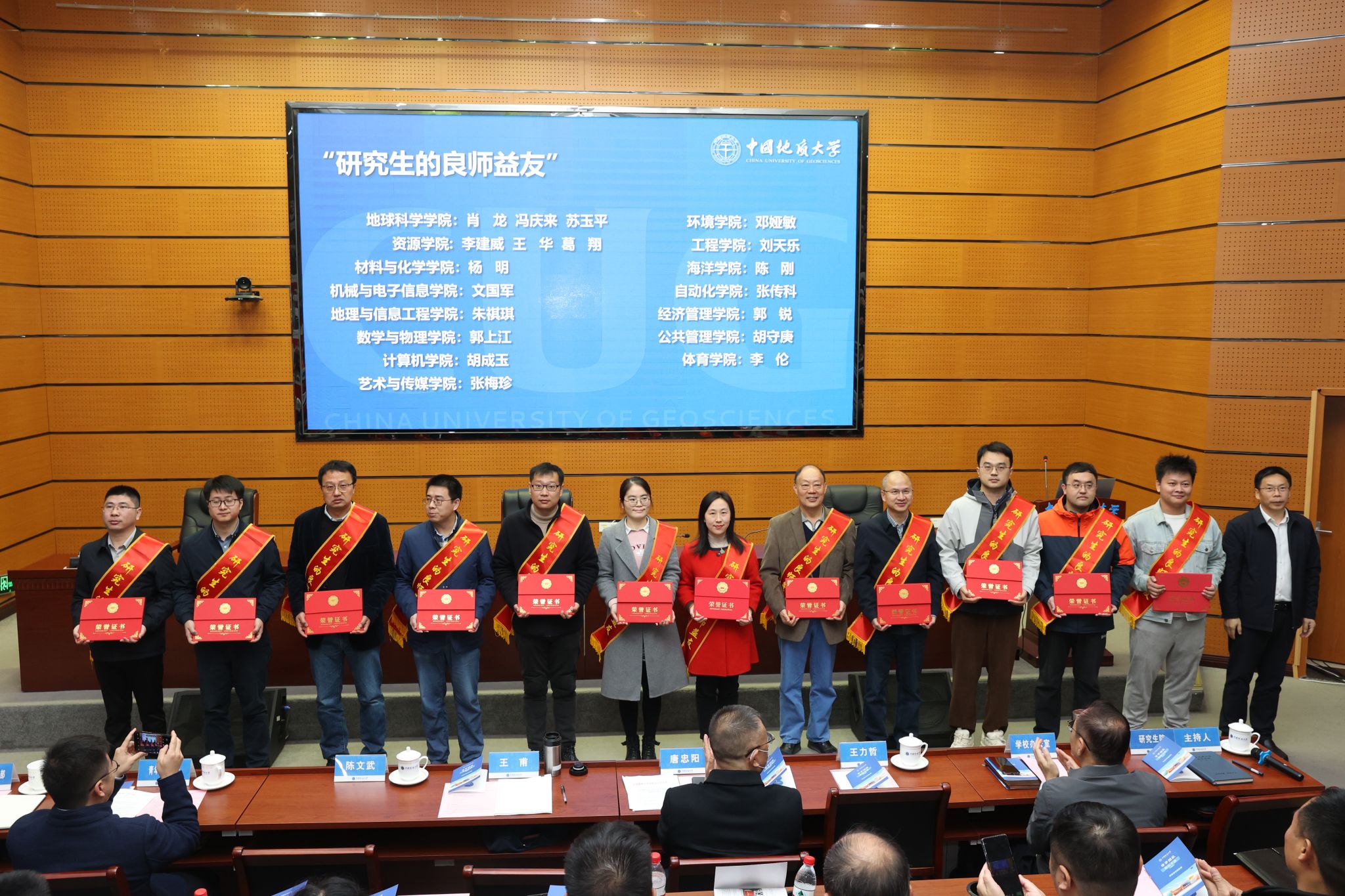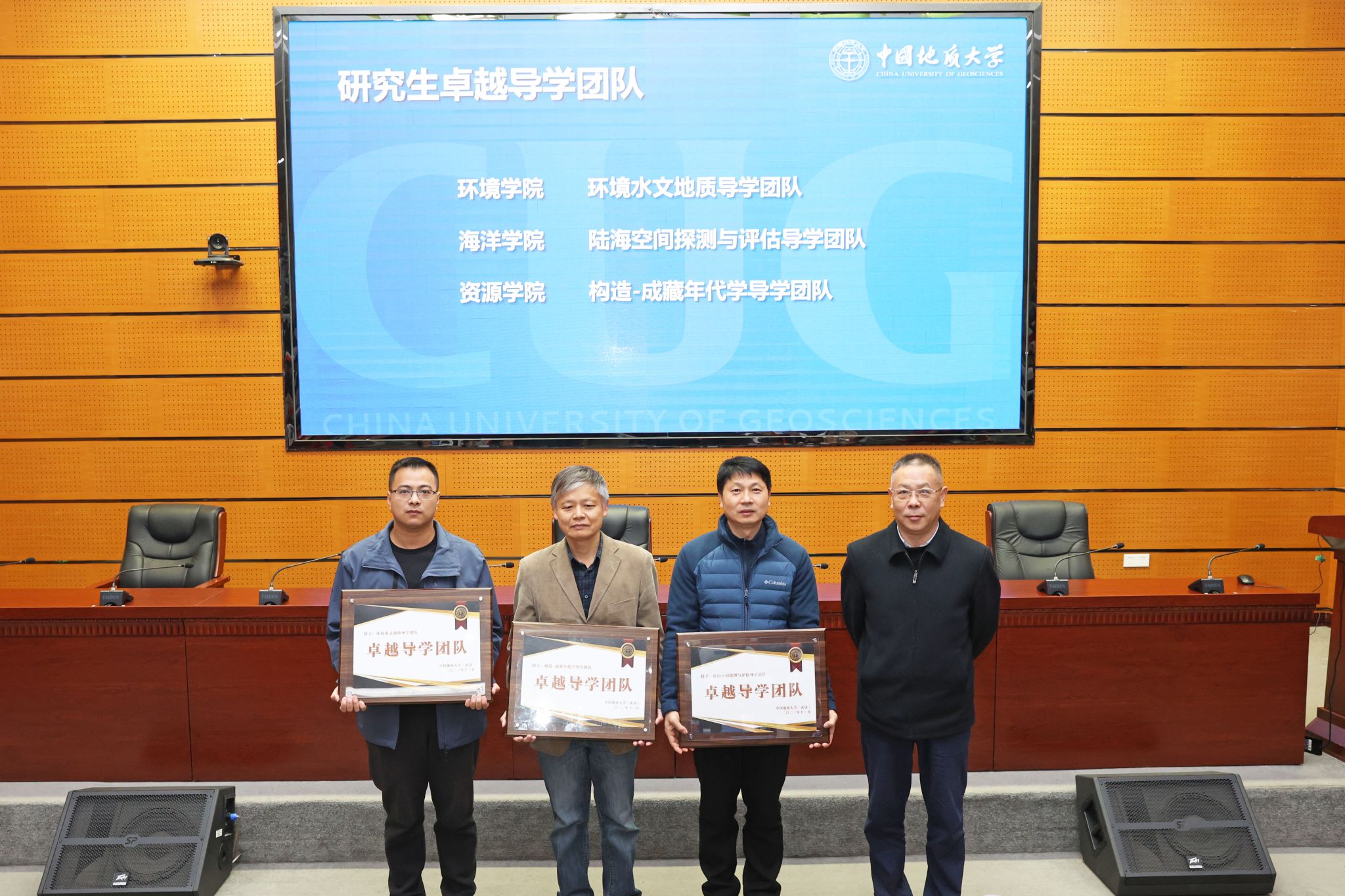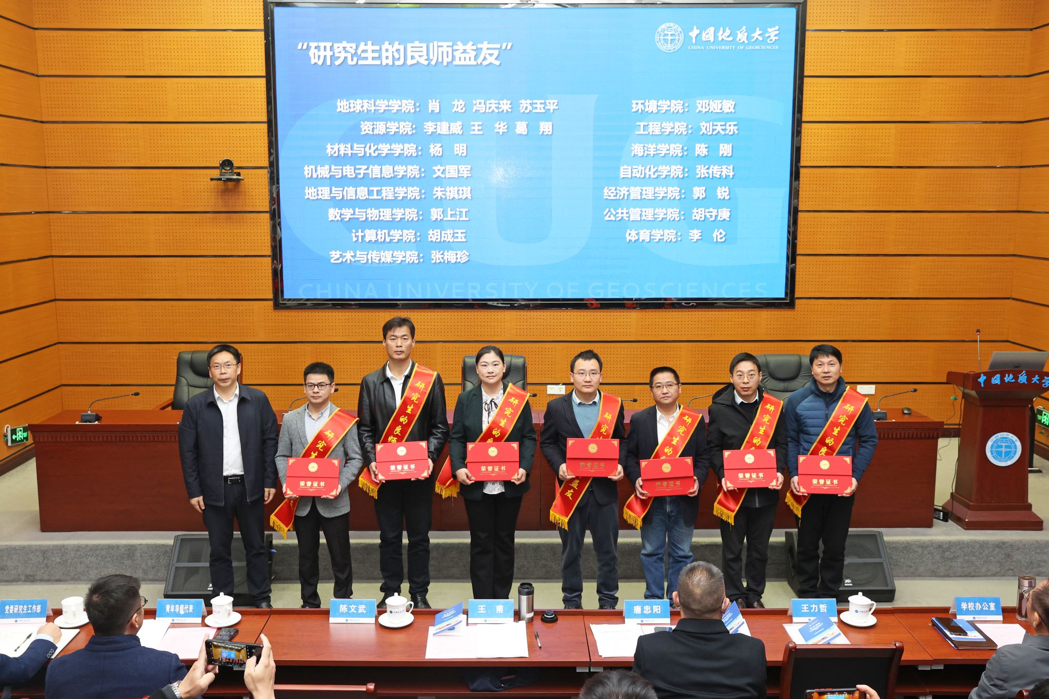 王甫宣讀表彰文件。環境學院環境水文地質導學團隊等3個團隊被評為卓越導學團隊;資源學院礦床學導學團隊等4個團隊被評為示范導學團隊;工程學院深部鉆探與能源地質工程導學團隊等12個團隊被評為優秀導學團隊;地球科學學院肖龍等19名教師被授予第九屆“研究生的良師益友”榮譽稱號。