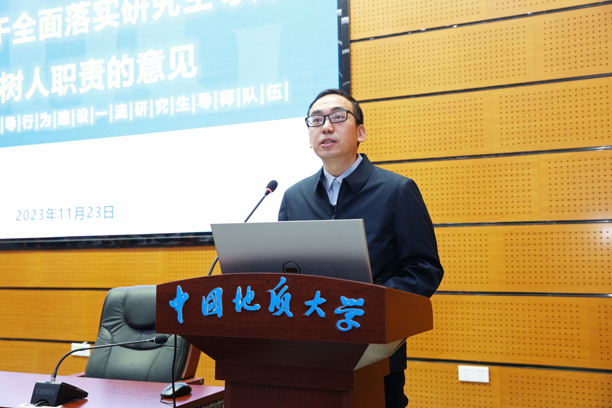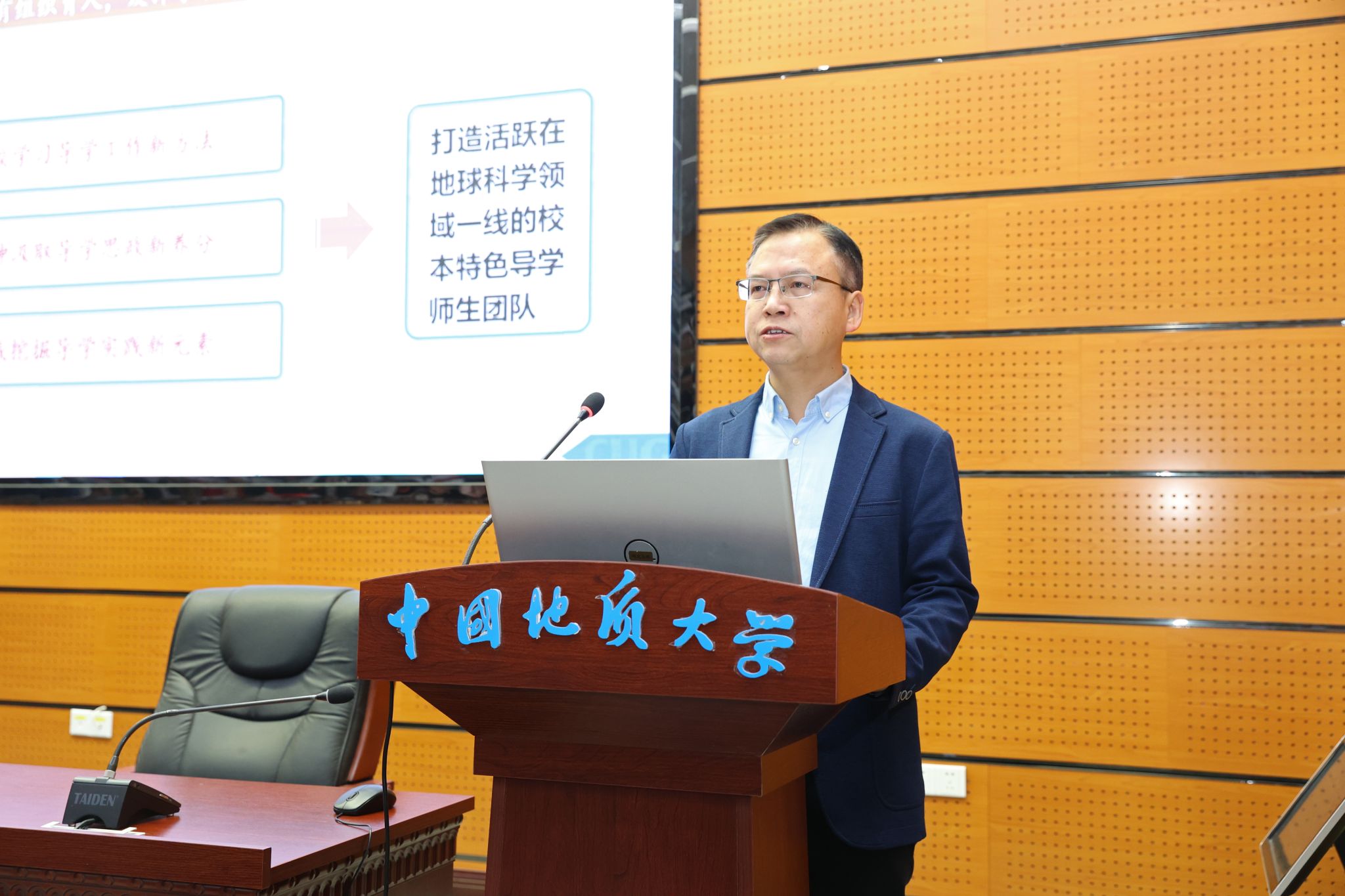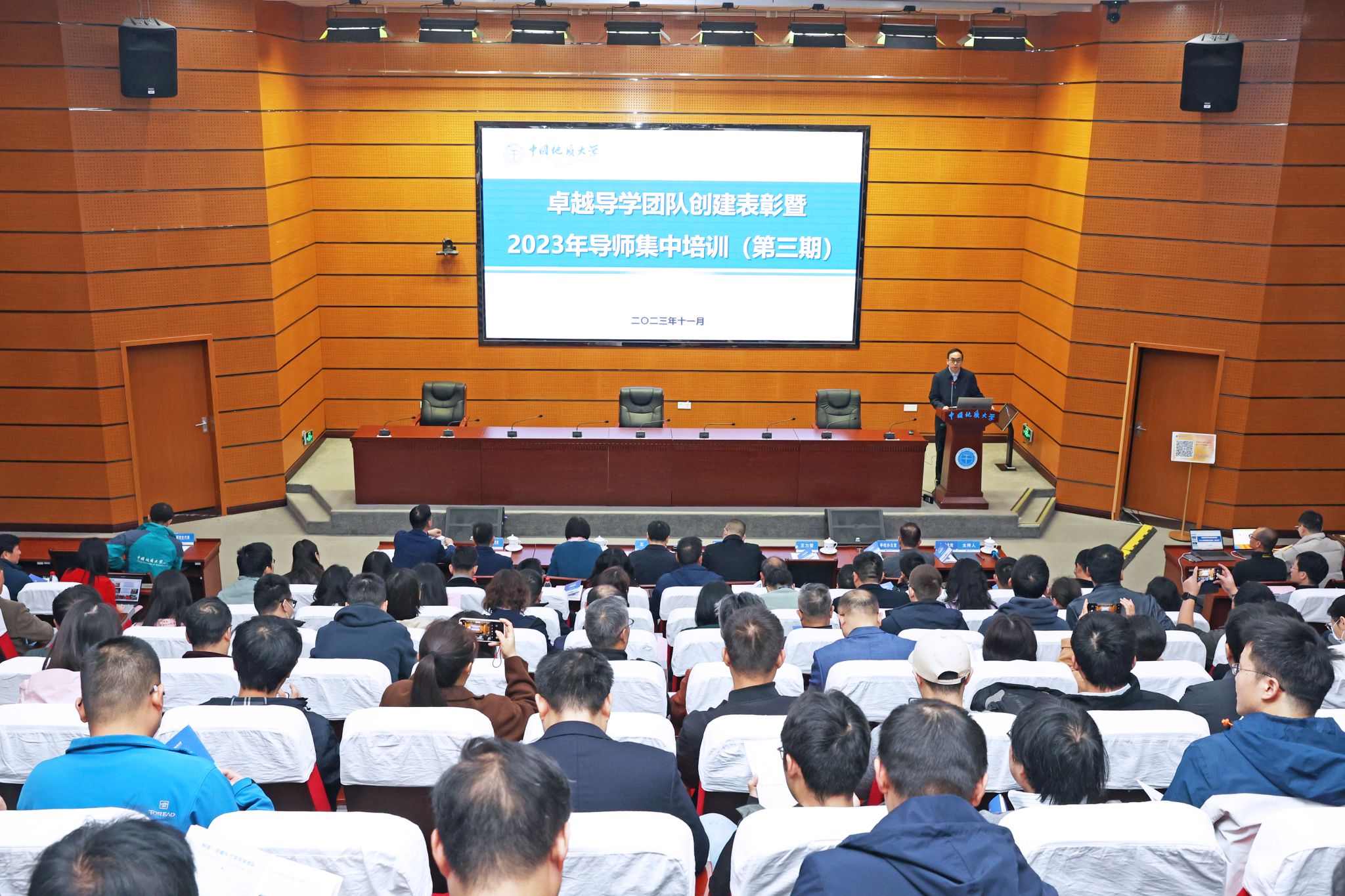地大新聞網訊(通訊員 龐偉紅 攝影 孫彥欽)11月23日,我校首屆卓越導學團隊創建表彰暨2023年導師集中培訓(第三期)在教學綜合樓A0113舉行。校黨委副書記唐忠陽、王甫,副校長王力哲,黨委常委、組織部部長陳文武,受表彰人員、導學團隊導師代表、參訓導師、各培養單位及相關管理與服務機構負責人等350余人參加大會。