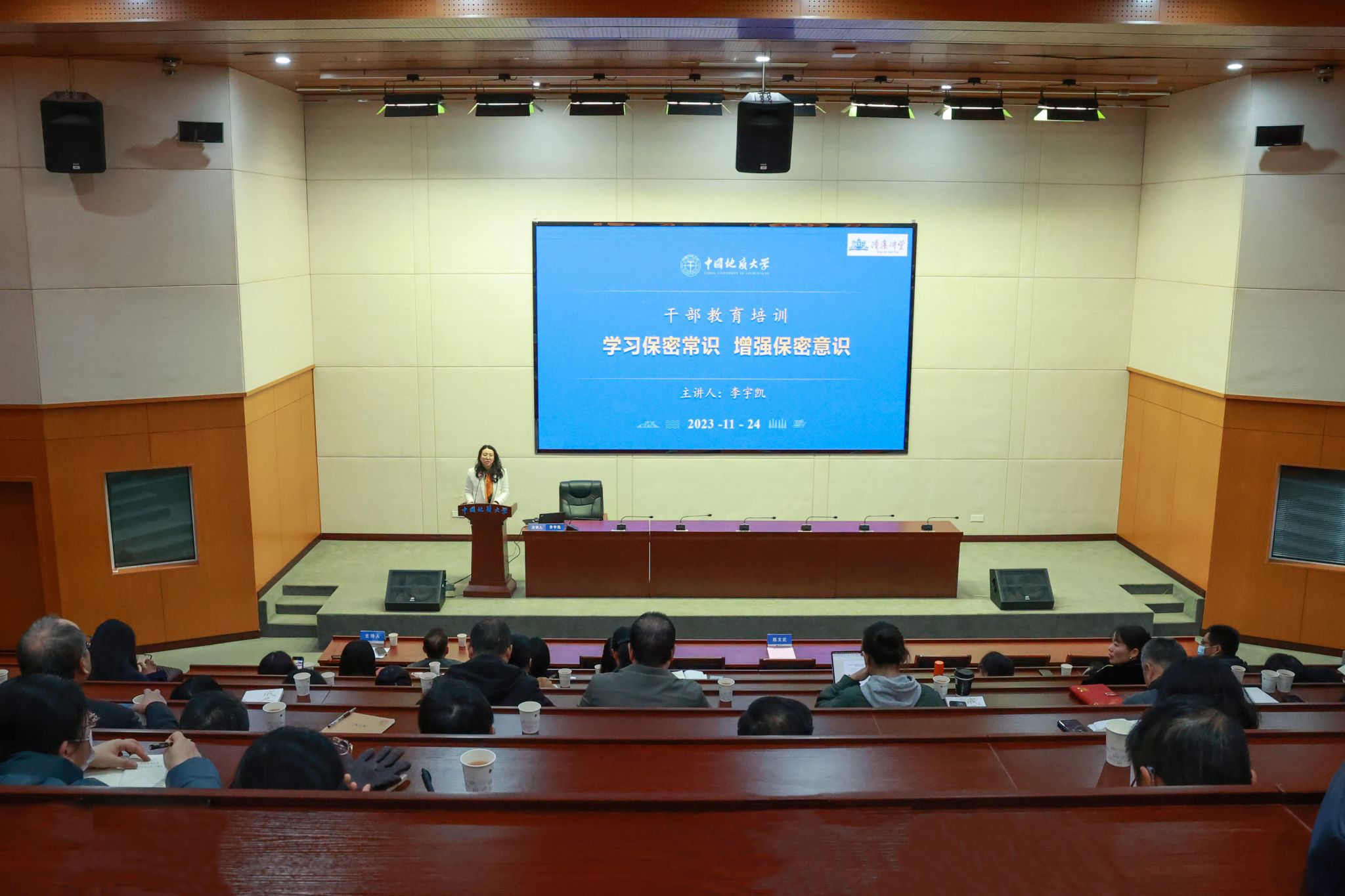 李宇凱以《學習保密常識,增強保密意識》為題作報告。他從保密傳統及相關概念、當前保密工作面臨的嚴峻形勢、保密違規違法案例解析和學校保密工作情況等,闡釋了做好保密工作的重大意義。他說,高校干部要深刻認識和準確把握保密工作面臨的新形勢新特點,立足國際秩序大變局把握保密工作,立足防范風險大前提統籌保密工作,立足國家發展大背景謀劃保密工作,將保密知識用在日常、落在實處,切實做到“知保密、懂保密、守秘密”,增強底線意識和危機意識,構筑國家秘密安全的堅固防線。