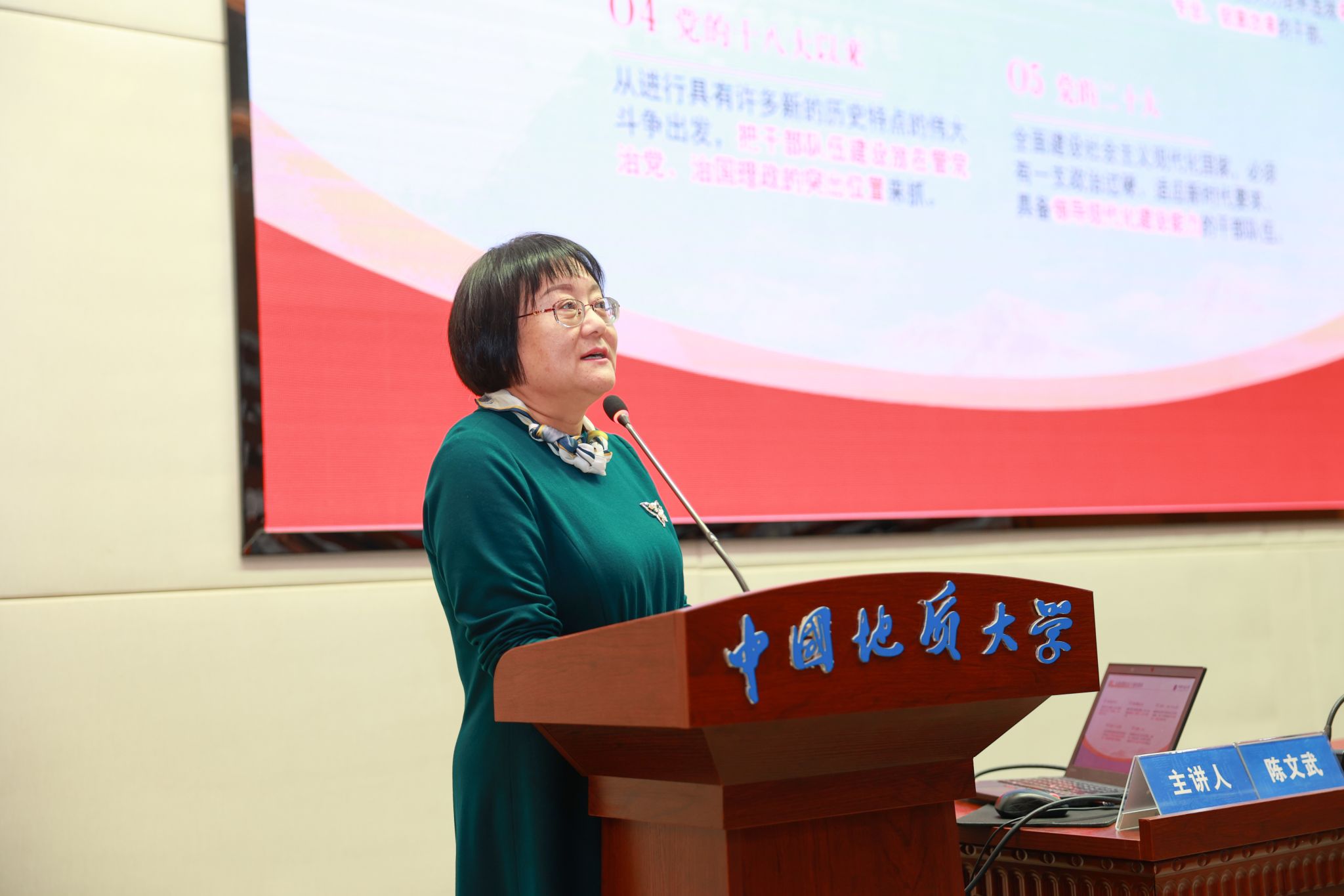 陳文武以《踐行新時代好干部標準,自覺扣好“第一粒扣子”》為題作報告。她從不同時期黨對干部的要求出發,闡述了黨的干部工作所取得的成果,結合習近平總書記關于干部工作的重要論述,深入剖析新時代好干部標準和必備素質,深度解讀學校十三次黨代會對于干部工作的具體要求。她希望,廣大干部要努力錘煉七種能力,做政治過硬的明白人、品德高尚的清白人、改革發展的領頭人、高效治理的推動者、良好生態的營造者,為加快建設地球科學領域國際知名研究型大學、不斷譜寫學校事業高質量發展的新篇章而努力奮斗。