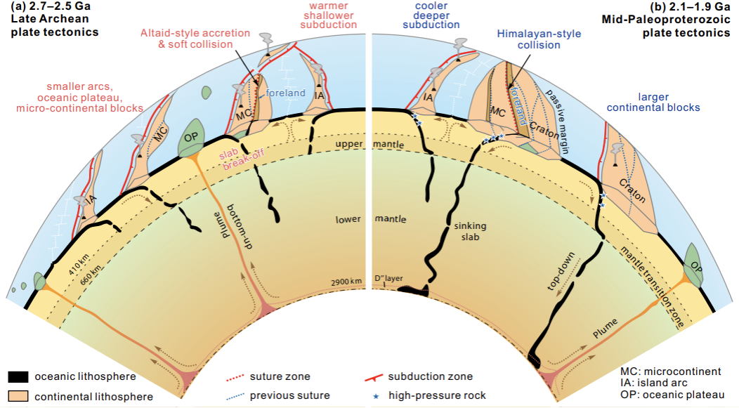 此外,研究團隊通過整合構造、碎屑金紅石/鋯石和變質大數據等多方面證據,約束了新太古代和古元古代明顯不同的變形和變質作用樣式,認為該樣式差異可能是新太古代和古元古代造山作用和板塊構造樣式發生轉變的響應,即太古宙以阿爾泰型弧陸增生—軟碰撞、缺乏高壓變質作用和形成超級克拉通等為特征,而古元古代廣泛發育喜馬拉雅型陸陸碰撞,出現冷俯沖、全球性超大陸聚合等為特征(圖2)。研究團隊進一步提出造山帶隆升—剝蝕及硅酸鹽風化過程可能對古元古代早期水圈、大氣圈和生物圈產生了重要影響,而有機物埋藏、沉積物俯沖等過程又進一步促使古元古代造山作用樣式的轉變,體現了固體—表生圈層相互作用和協同演變的復雜地球系統演化觀。