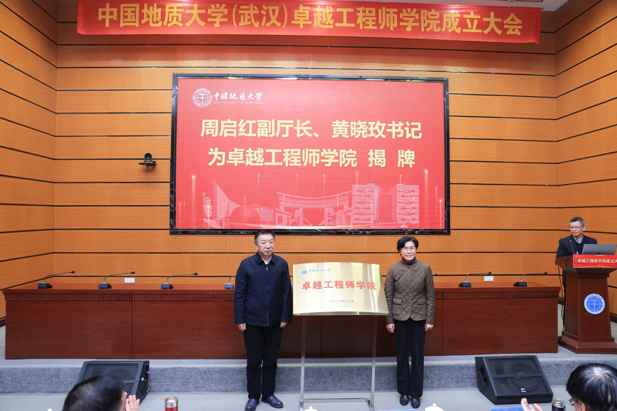 地大新聞網訊 (記者 孫彥欽 通訊員 王任 攝影 王俊芳 焦思勤)12月28日,我校卓越工程師學院成立大會在南望山校區A0113會議室舉行。湖北省教育廳黨組成員、副廳長周啟紅,湖北省委組織部人才處副處長翟霄,湖北省自然資源廳科技處處長周嵐,湖北省人民政府國有資產監督管理委員會企業領導人員管理處四級調研員邱文凱,理事單位領導及代表,我校校領導黃曉玫、王焰新、王林清、劉杰、唐忠陽、王甫、李建威,黨委常委、組織部部長陳文武,校長助理蔣少涌、呂一兵,相關管理服務機構、教學科研機構負責人,導師代表和學生代表等參加活動。