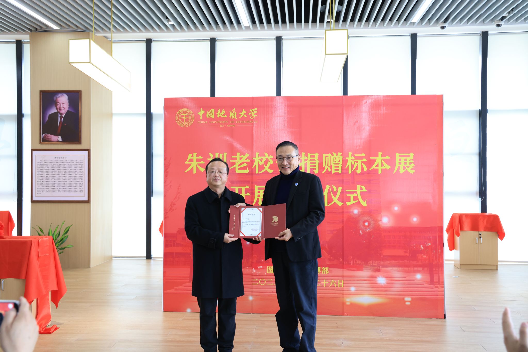 地大新聞網訊(通訊員 曾思紅 徐燕 攝影 焦思勤 朱靖安 丁洪宇)12月26日,“朱訓老校長捐贈標本展”在未來圖書館“朱訓書屋”開展。朱訓長子朱宇江,中國科協科普研究所原副所長王玉平研究員,校黨委副書記王甫,相關單位負責人及師生代表參加開展揭幕儀式。圖書檔案與文博部黨委書記鄧云濤主持開展儀式。
