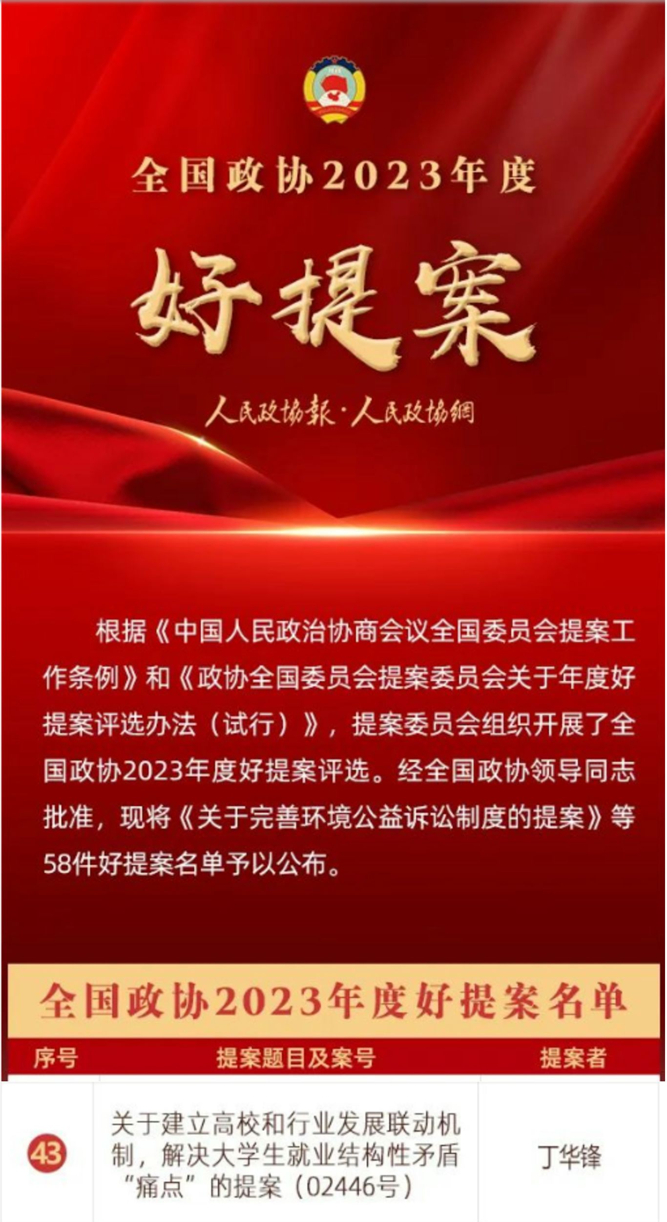 地大新聞網訊(記者 王俊芳)根據《中國人民政治協商會議全國委員會提案工作條例》和《政協全國委員會提案委員會關于年度好提案評選辦法(試行)》,提案委員會組織開展了全國政協2023年度好提案評選,好提案總量為年度提案總數的1%左右。近日,經全國政協領導同志批準,58件好提案名單公布。全國政協委員、民革湖北省委會副主委、中國地質大學(武漢)機械與電子信息學院院長丁華鋒的提案《關于建立高校和行業發展聯動機制,解決大學生就業結構性矛盾”痛點“的提案》位列其中。