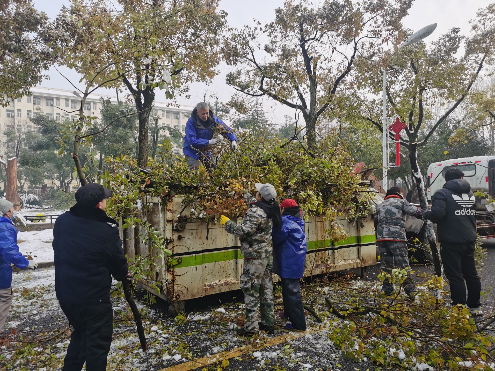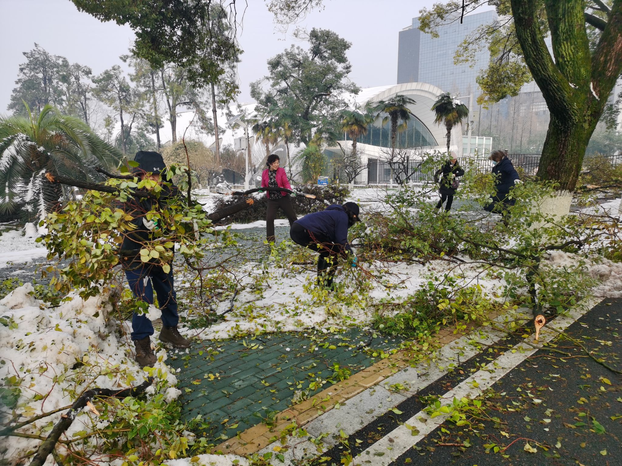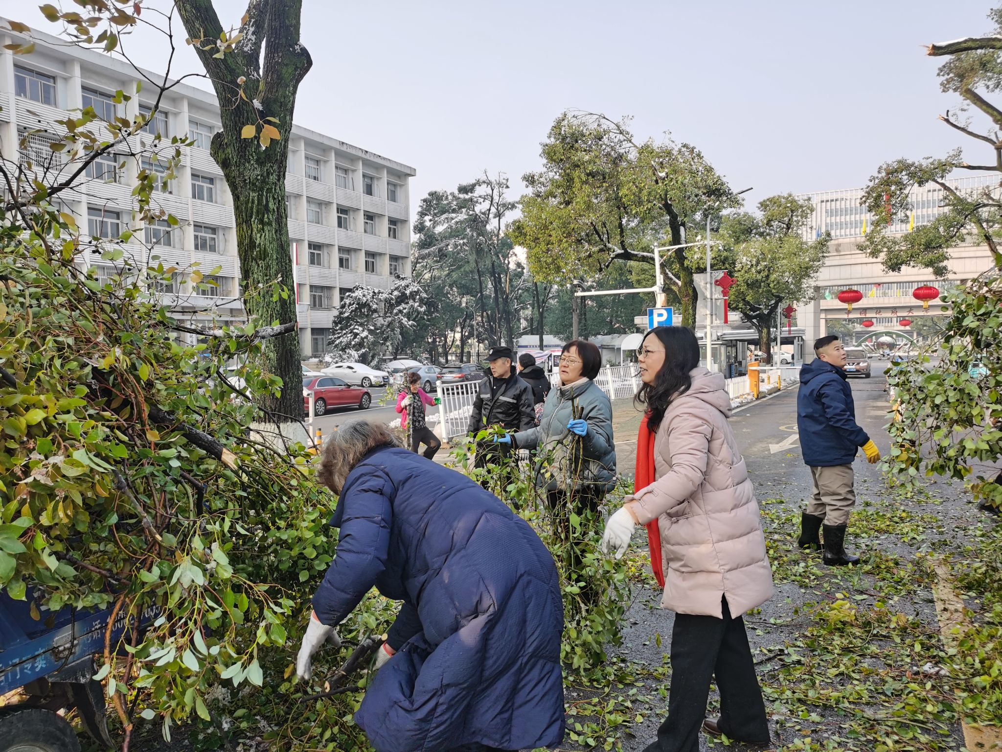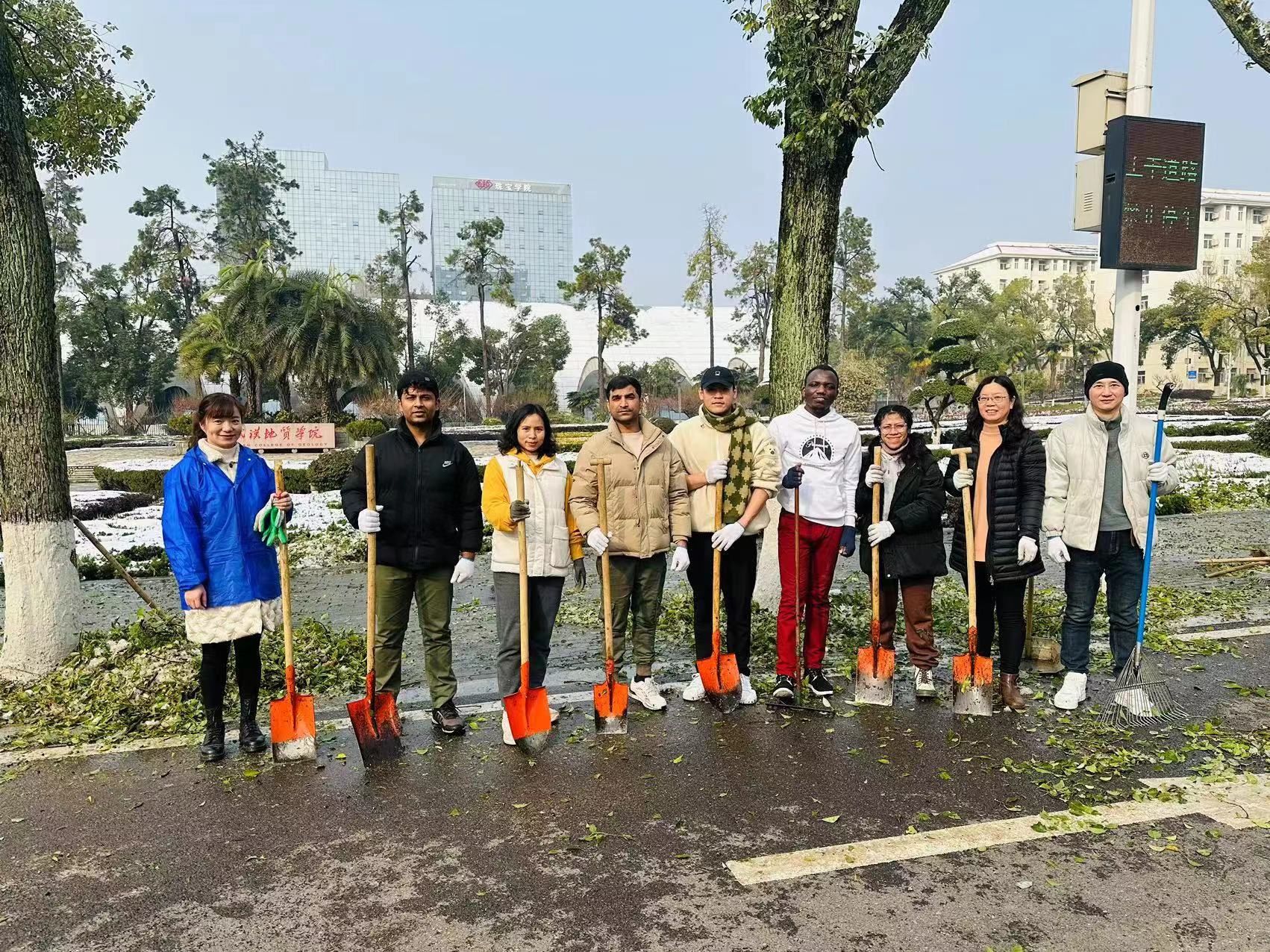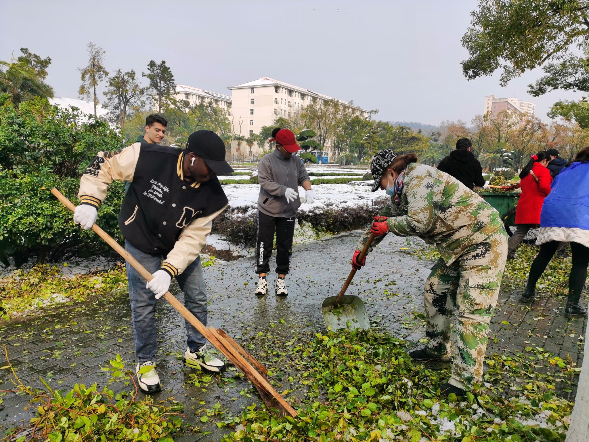 為了美化校園環境、營造安全祥和的春節氛圍,讓師生員工及社區居民有更好的校園生活體驗,2月8日,學校黨委組織黨員干部、志愿者在學校主干道旁集中開展清理殘枝落葉工作。副校長劉杰來到現場了解受災情況,查看倒伏樹木、斷落樹枝處置情況并協助清理樹枝。刺骨的寒風中,80余名后勤物業工作人員、30余名教職工黨員及居民志愿者和30余名國際留學生,深入校園主次干道和各個支路,用雙手清理散落樹枝和殘枝,熱火朝天的干勁讓這個冬日校園變得溫暖。經過一天奮戰,學校主要人行道路全面清通。