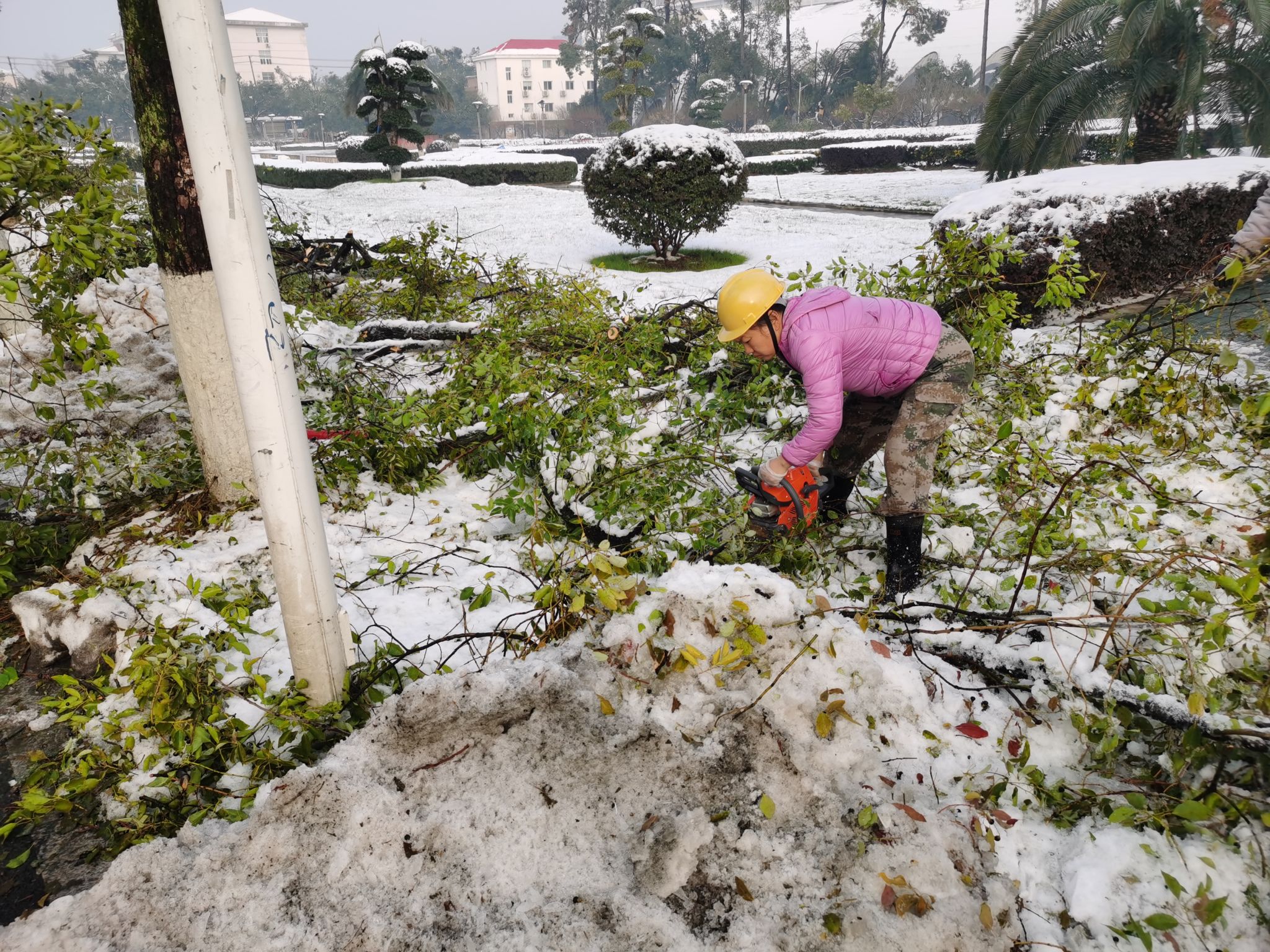 校園物業經過連續作業,已清理倒伏樹木40余棵、斷枝4000余處,租用吊車處理斷落隱患樹木60余棵,但目前仍有大量被冰雪壓斷的樹枝橫七豎八掉落在地,還有部分人行道路被樹枝阻塞,影響了正常通行,破壞了校園美景。