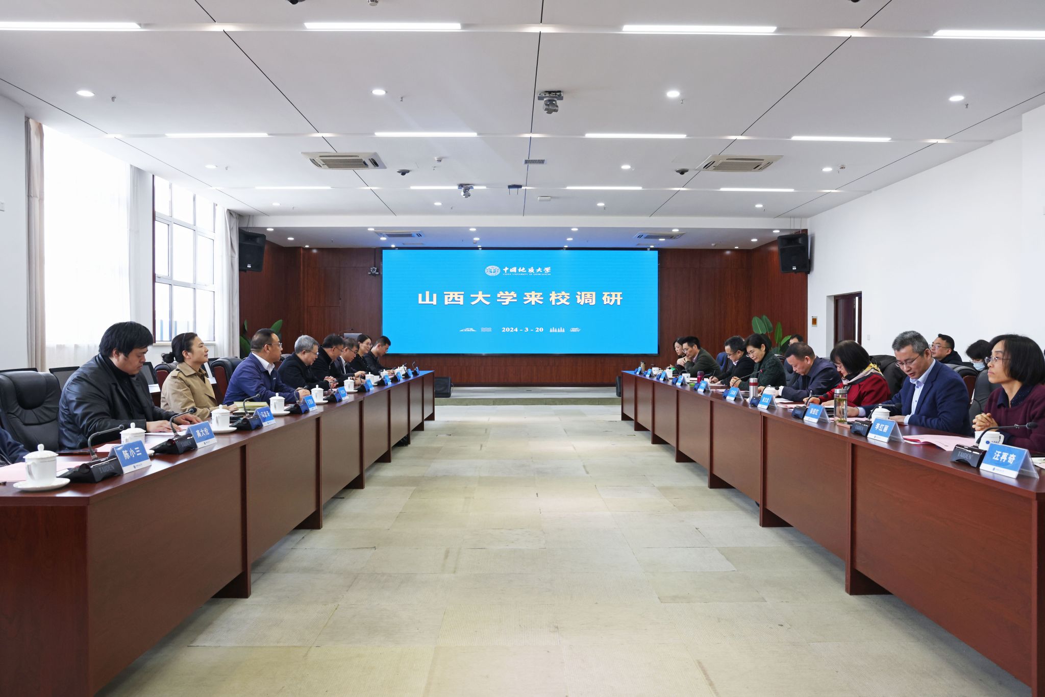 地大新聞網訊 (記者 孫彥欽)3月20日,山西大學黨委書記王仰麟,黨委副書記、副校長張天才,黨委常委、副校長程芳琴、孫巖一行來校調研。我校黨委書記黃曉玫,黨委副書記王林清,副校長王力哲,黨委常委、組織部部長陳文武,相關單位負責人參加座談會。王林清主持會議。