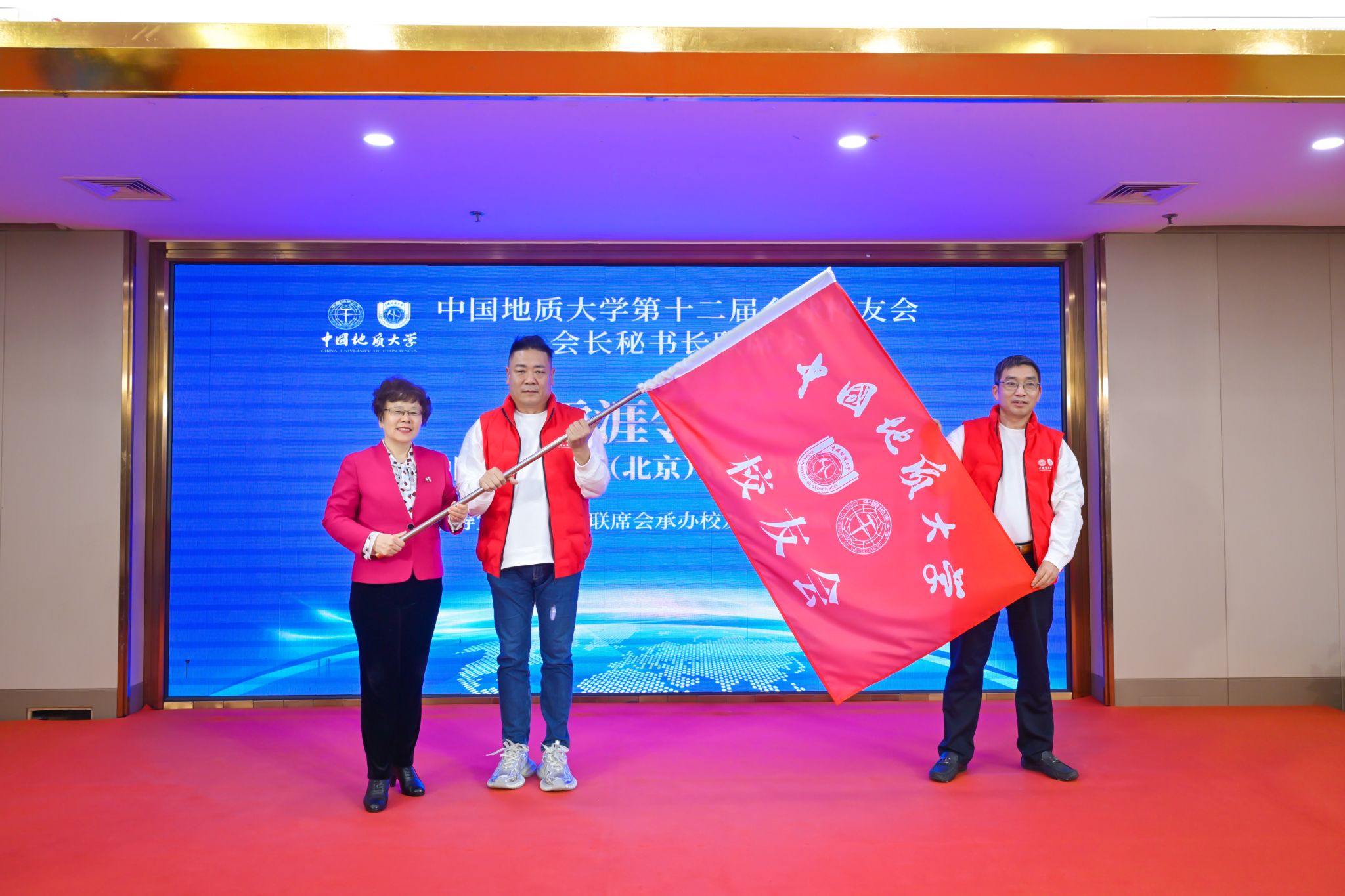 雷涯鄰為下一屆地質(zhì)資源環(huán)境高峰論壇暨全球校友會(huì)會(huì)長(zhǎng)秘書長(zhǎng)聯(lián)席會(huì)承辦單位湖南校友會(huì)授旗,湖南校友會(huì)常務(wù)副會(huì)長(zhǎng)鄧星平、秘書長(zhǎng)周紅橋共同接旗。