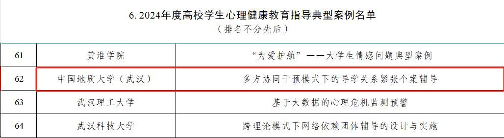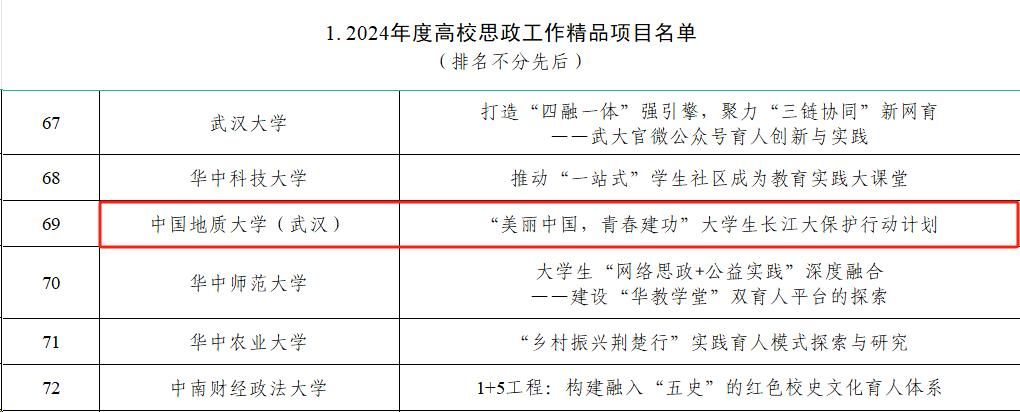 地大新聞網訊(記者 梁睿華 許小康)日前,教育部公布了2024年度思想政治工作質量提升綜合改革與精品建設項目入選名單,我校共有兩個項目入選。《“美麗中國 青春建功”大學生長江大保護行動計劃》入選高校思政工作精品項目,《多方協同干預模式下的導學關系緊張個案輔導》入選高校學生心理健康教育指導典型案例。