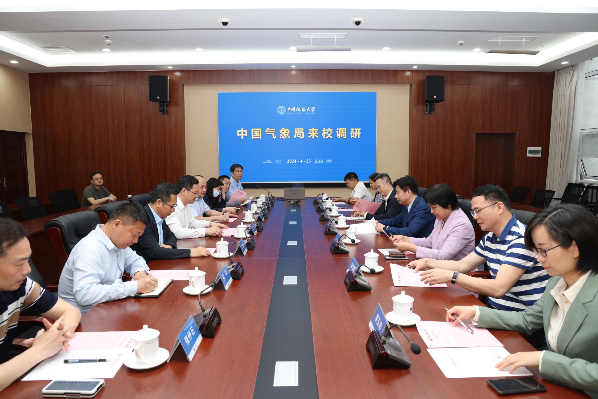 地大新聞網(wǎng)訊 (通訊員 劉鳳蓮 孔少飛 攝影 焦思勤)4月24日,中國氣象局黨組成員、副局長熊紹員,減災(zāi)司副司長張迪等一行來校,就我校大氣科學(xué)學(xué)科建設(shè)、局校合作等相關(guān)工作開展調(diào)研。湖南省氣象局黨組書記、局長鄭宏翔,湖北省氣象局黨組書記、局長胡愛軍,黨組成員、副局長張鴻雁,科技與預(yù)報(bào)處處長姜玉印等陪同調(diào)研。我校副校長劉杰,環(huán)境學(xué)院院長史建波,大氣科學(xué)系教師代表以及相關(guān)職能單位負(fù)責(zé)人參加座談交流。學(xué)校辦公室主任張瑋主持會(huì)議。