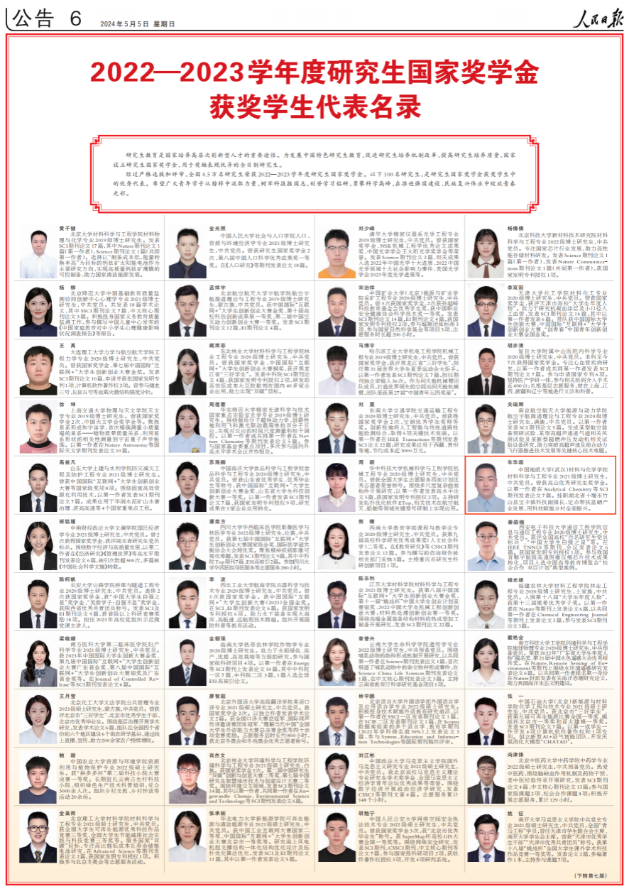地大新聞網訊 2022—2023學年,全國4.5萬人榮獲研究生國家獎學金。5月5日,《人民日報》用多個整版刊登了其中100位優秀研究生代表的事跡簡況。我校2021級博士研究生車華超名列其中。
