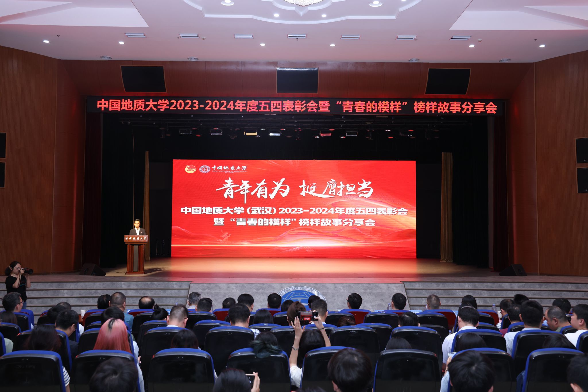 地大新聞網(wǎng)訊(通訊員 彭梓恒 劉明輝 攝影 焦思勤 萬(wàn)泳村 邢梁依脈)挺膺擔(dān)當(dāng)?shù)Z青春,奮楫篤行向未來(lái)。5月14日,學(xué)校2023-2024年度五四表彰會(huì)暨“青春的模樣”榜樣故事分享會(huì)在弘毅堂舉行。校黨委書記黃曉玫,共青團(tuán)湖北省委學(xué)校部部長(zhǎng)李文,黨委副書記王林清,副校長(zhǎng)劉杰,黨委副書記、紀(jì)委書記唐忠陽(yáng),副校長(zhǎng)李建威,第28屆“中國(guó)青年五四獎(jiǎng)?wù)隆鲍@得者、環(huán)境學(xué)院2013屆本科畢業(yè)生及2016屆碩士畢業(yè)生羅鋒,2022年“湖北青年五四獎(jiǎng)?wù)隆鲍@得者、材料與化學(xué)學(xué)院教授婁筱叮,相關(guān)職能部門負(fù)責(zé)人,各學(xué)院黨委書記、黨委副書記、團(tuán)委工作負(fù)責(zé)人,獲獎(jiǎng)師生代表、廣大青年師生代表共計(jì)1300余人參加會(huì)議。校團(tuán)委書記朱丹主持表彰會(huì)。