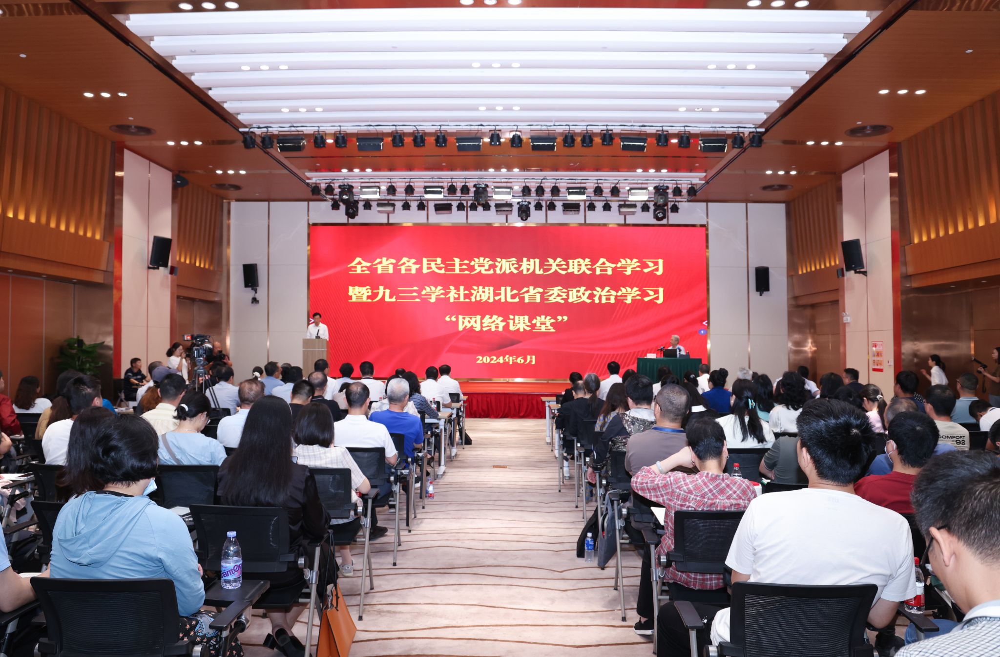 中共湖北省委宣傳部副部長趙理富,中共湖北省委統戰部副部長、省社會主義學院黨委書記邵志祥,東湖高新區黨工委委員、管委會副主任沈陽東,湖北省各民主黨派專職副主委及機關干部,我校宣傳部、統戰部等相關單位負責人,各民主黨派代表、我校統戰團體代表200余人在現場參加會議。7000余名九三學社社員線上參加網絡課堂。