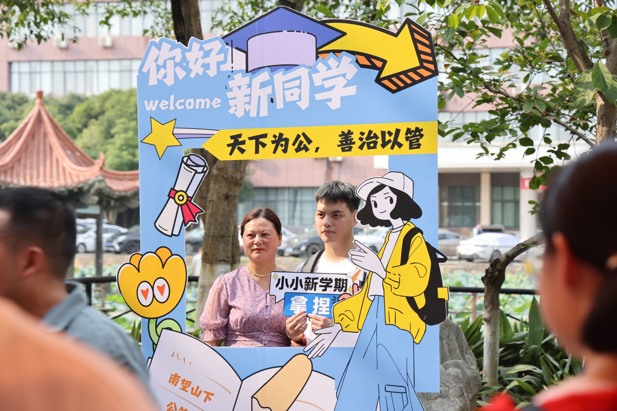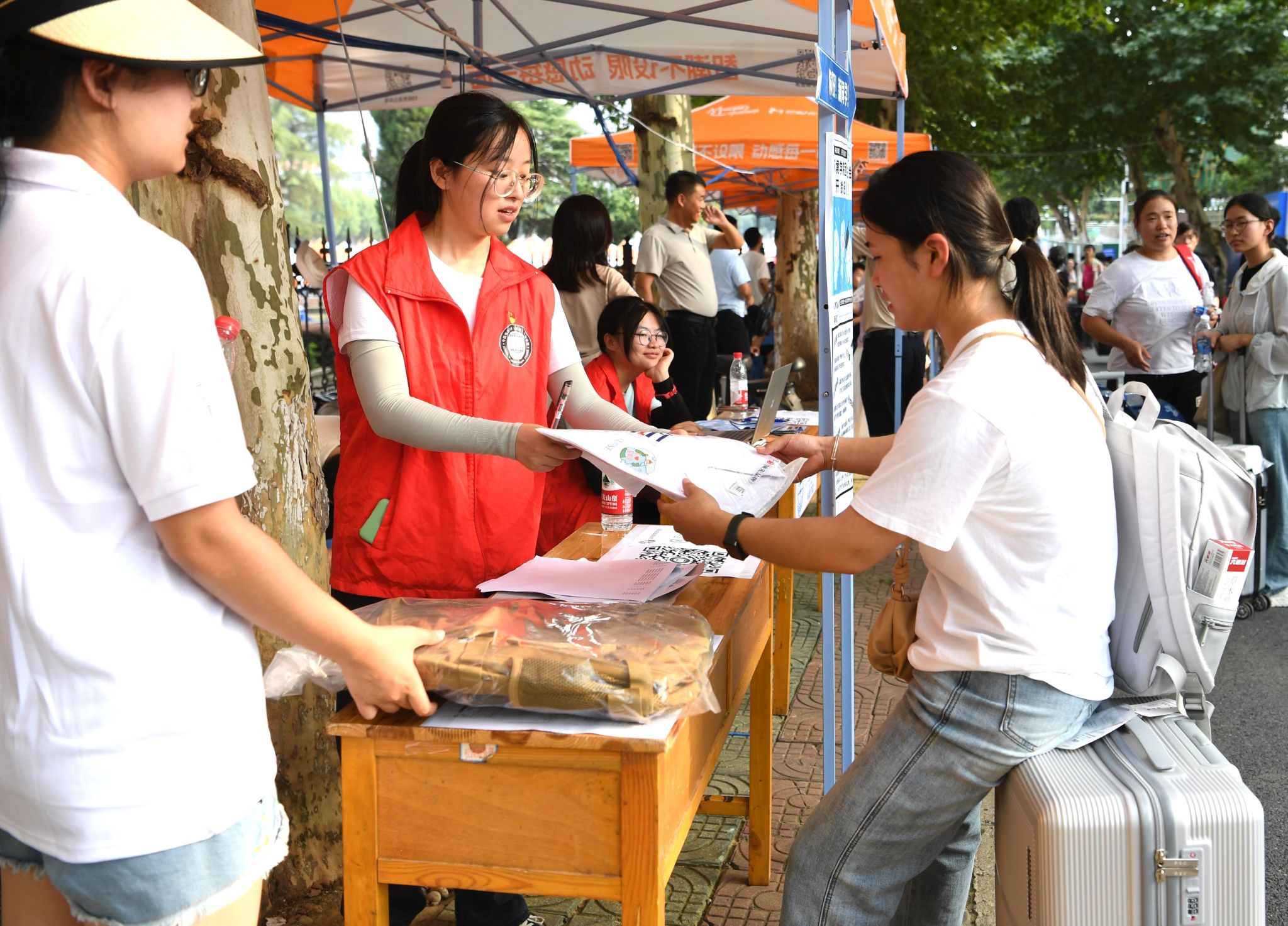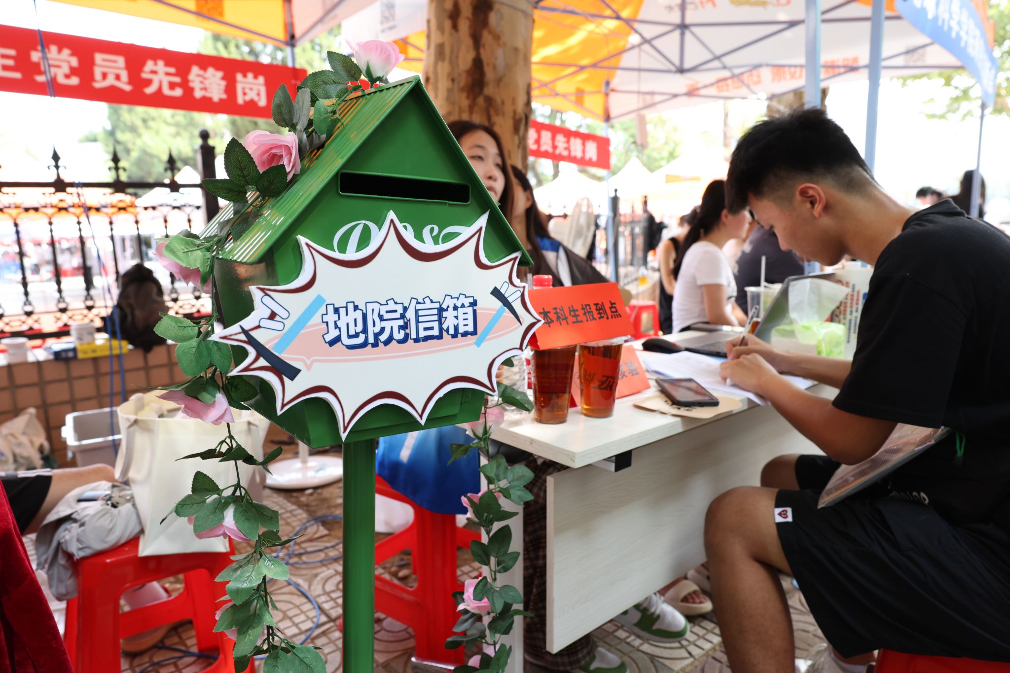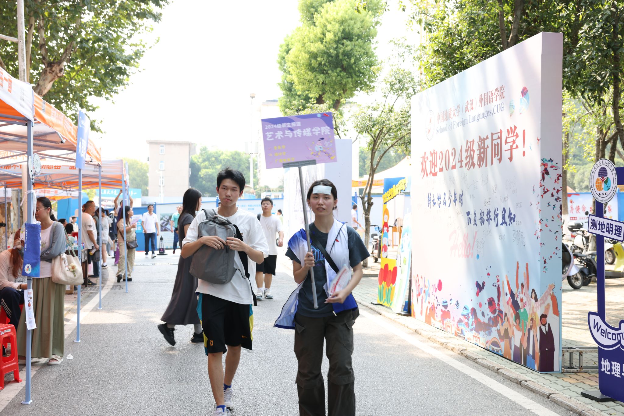 大轉盤、簽名墻、各式小禮品……雖烈日炎炎,但空氣中氤氳著歡樂的氣息。微笑、擁抱、定格,在各學院的迎新報到點,大家把美好記憶珍藏。