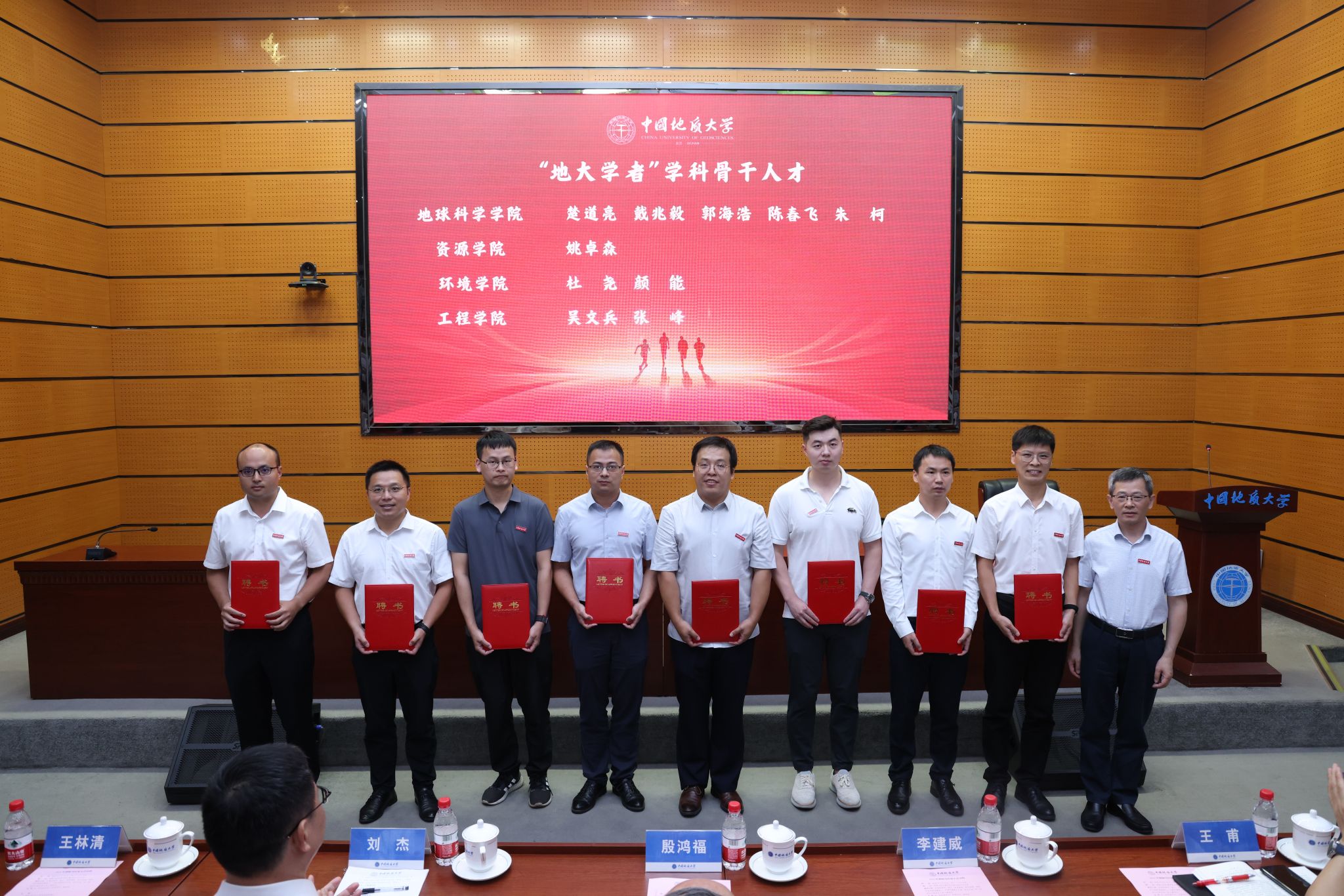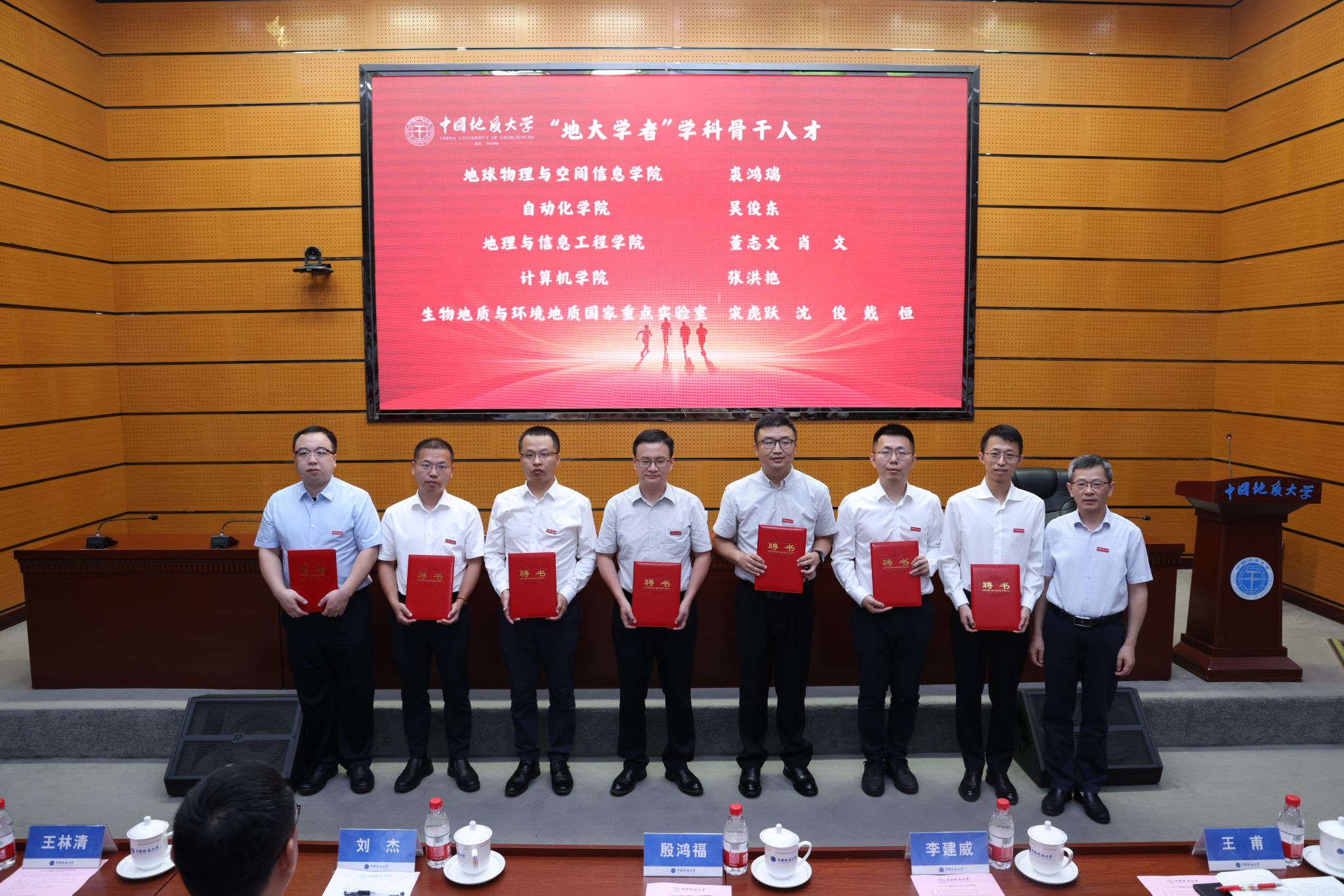 李建威向地球科學學院楚道亮、陳春飛、朱柯,資源學院姚卓森,環境學院杜堯、顏能,工程學院吳文兵、張峰,地球物理與空間信息學院裘鴻瑞,自動化學院吳俊東,地理與信息工程學院董志文,計算機學院張洪艷,生物地質與環境地質國家重點實驗室宋虎躍、沈俊、戴恒等頒發“地大學者”學科骨干人才聘書。