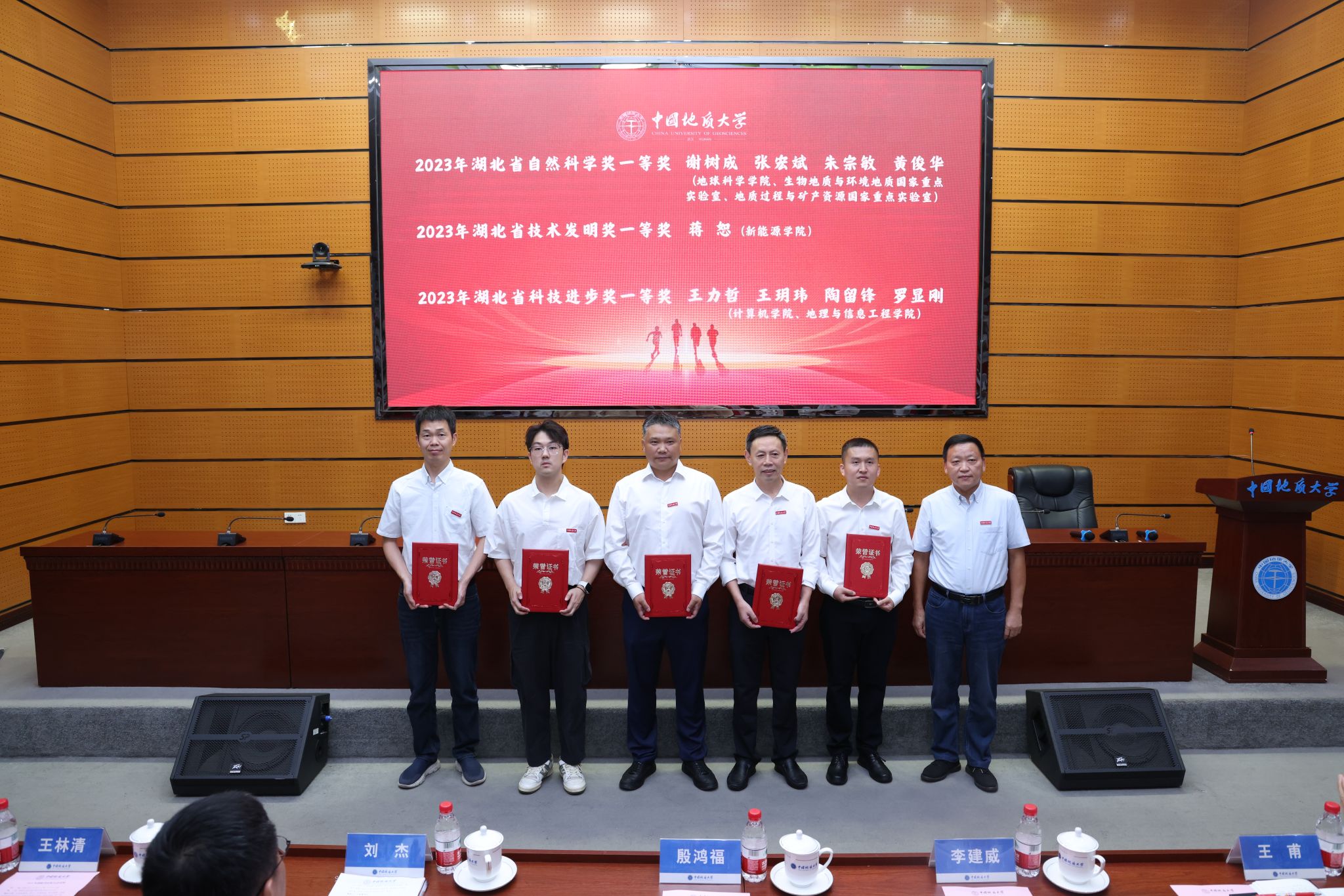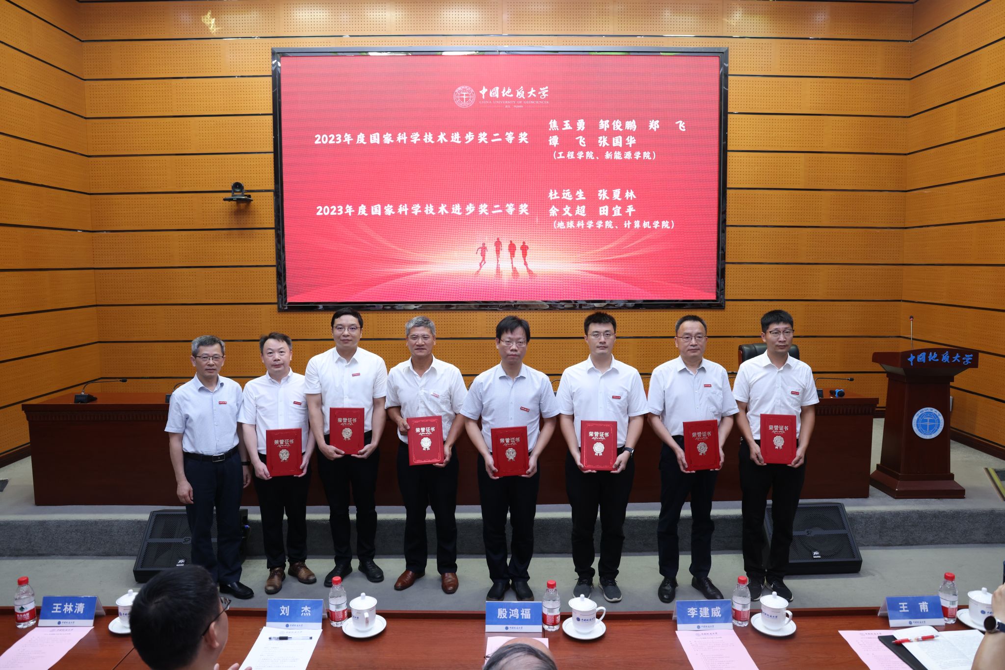 黨委副書記王林清向“2023年湖北省自然科學獎一等獎”獲得者謝樹成院士、張宏斌、朱宗敏、黃俊華等,“2023年湖北省技術發明獎一等獎”獲得者蔣恕,“2023年湖北省科技進步獎一等獎”獲得者王力哲、王玥瑋、陶留鋒、羅顯剛等團隊選派的教師代表頒發榮譽證書。