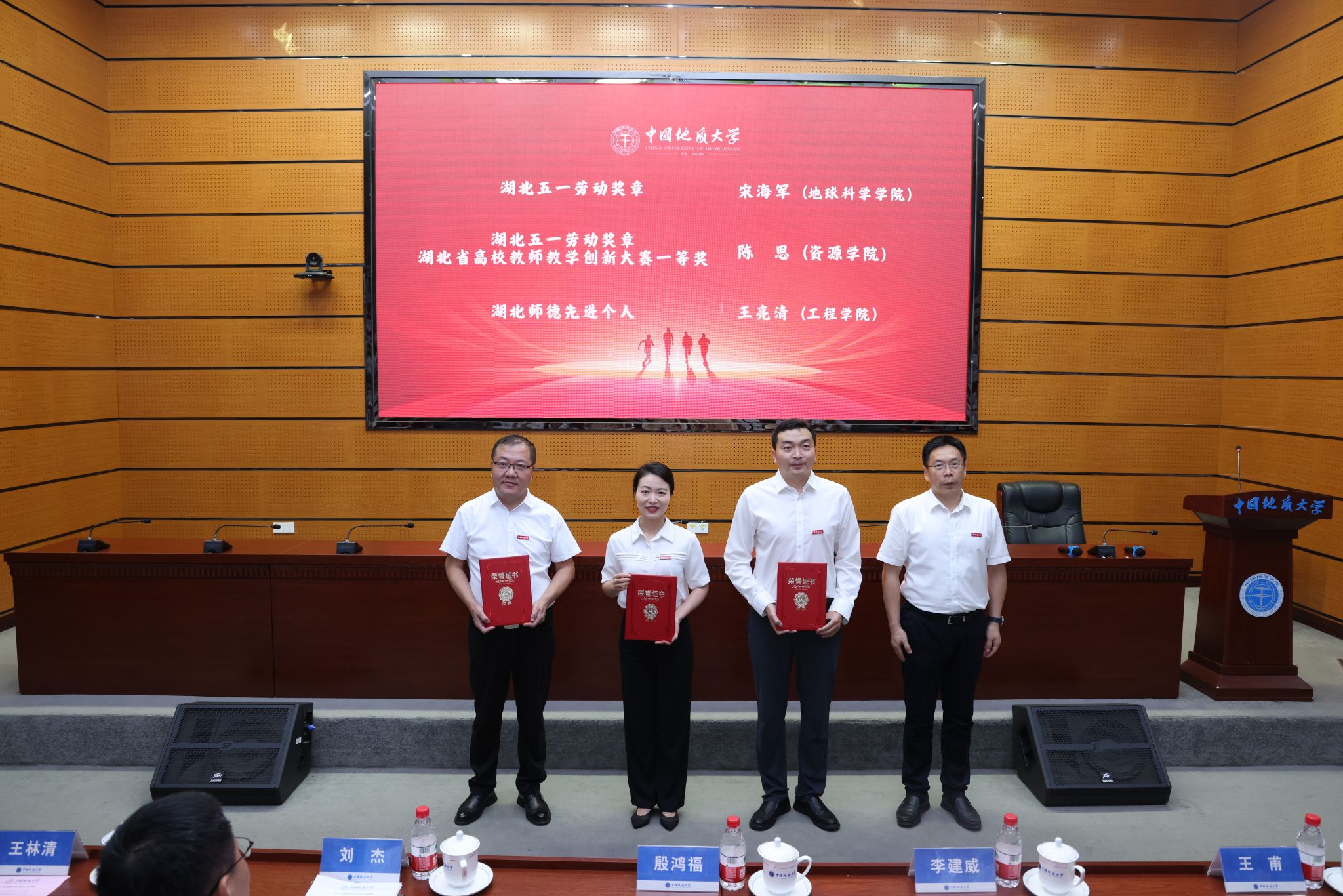 黨委副書記王甫向“湖北五一勞動獎章”獲得者宋海軍、“湖北五一勞動獎章”“湖北省高校教師教學創新大賽一等獎”獲得者陳思、“湖北師德先進個人”獲得者王亮清頒發榮譽證書。