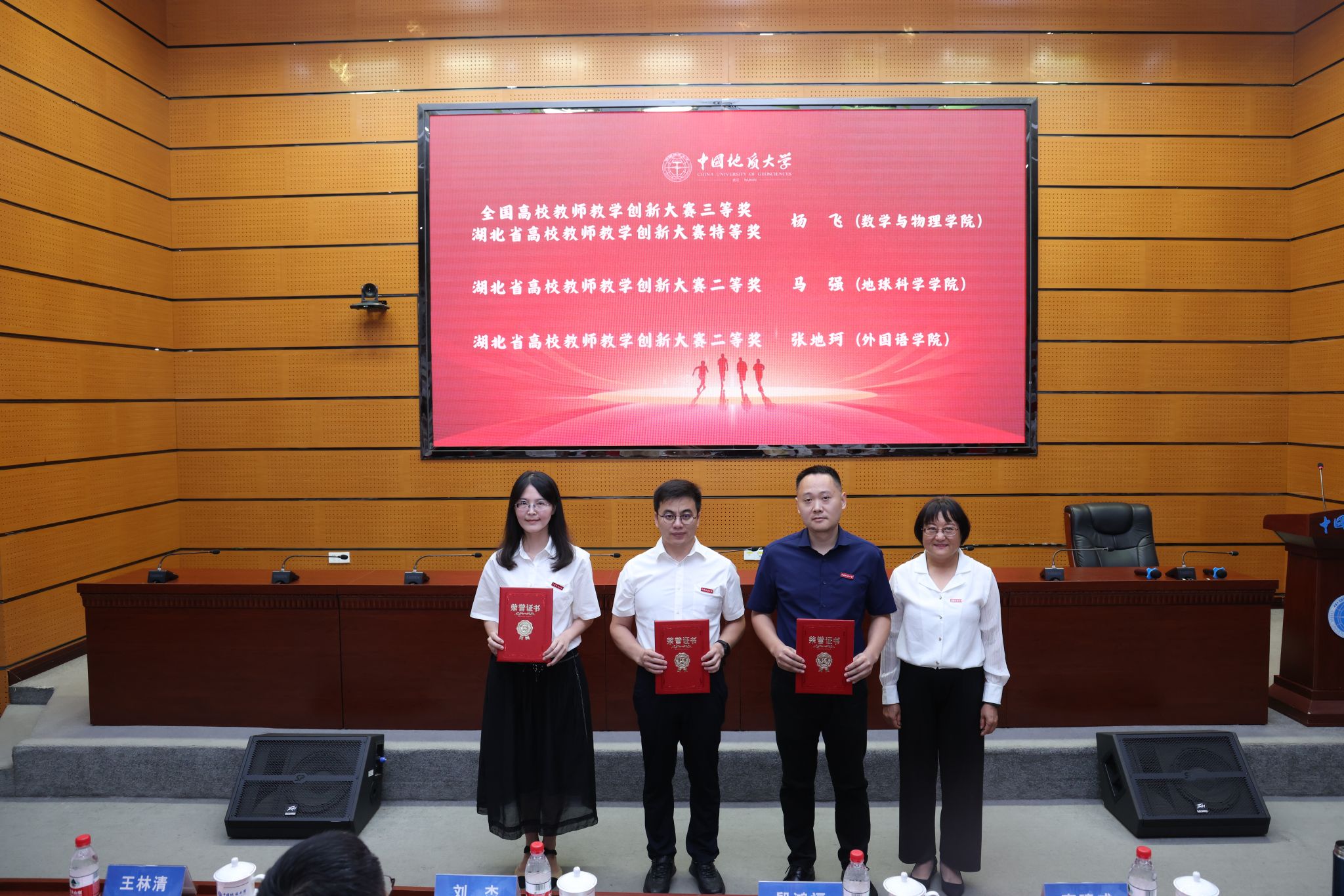 黨委常委、組織部部長、統戰部部長陳文武向“全國高校教師教學創新大賽三等獎”“湖北省高校教師教學創新大賽特等獎”獲得者楊飛、“湖北省高校教師教學創新大賽二等獎”獲得者馬強、張地珂頒發榮譽證書。