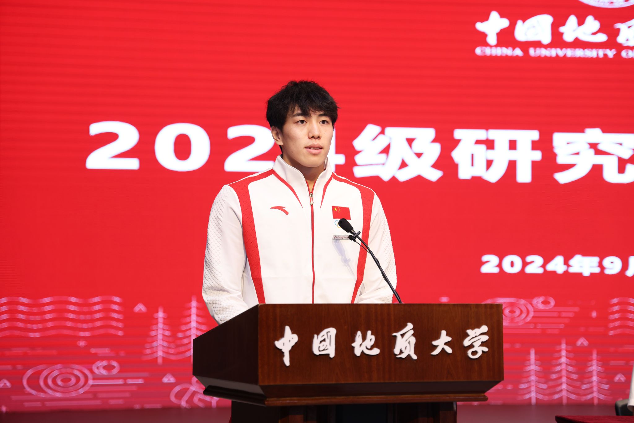 在校生代表、2024年巴黎奧運(yùn)會(huì)男子4*100米混合泳接力冠軍、體育學(xué)院體育學(xué)專業(yè)碩士研究生孫佳俊同學(xué)發(fā)言。他用“厚積薄發(fā)”“臨危受命”和“心懷感恩”三個(gè)關(guān)鍵詞與大家分享了他的奪冠故事,新生們備受鼓舞。他號召同學(xué)們以飽滿的熱情和堅(jiān)定的意志,共同在求知的道路上探索,逐夢前行,登上屬于每個(gè)人自己的“奧運(yùn)之巔”。