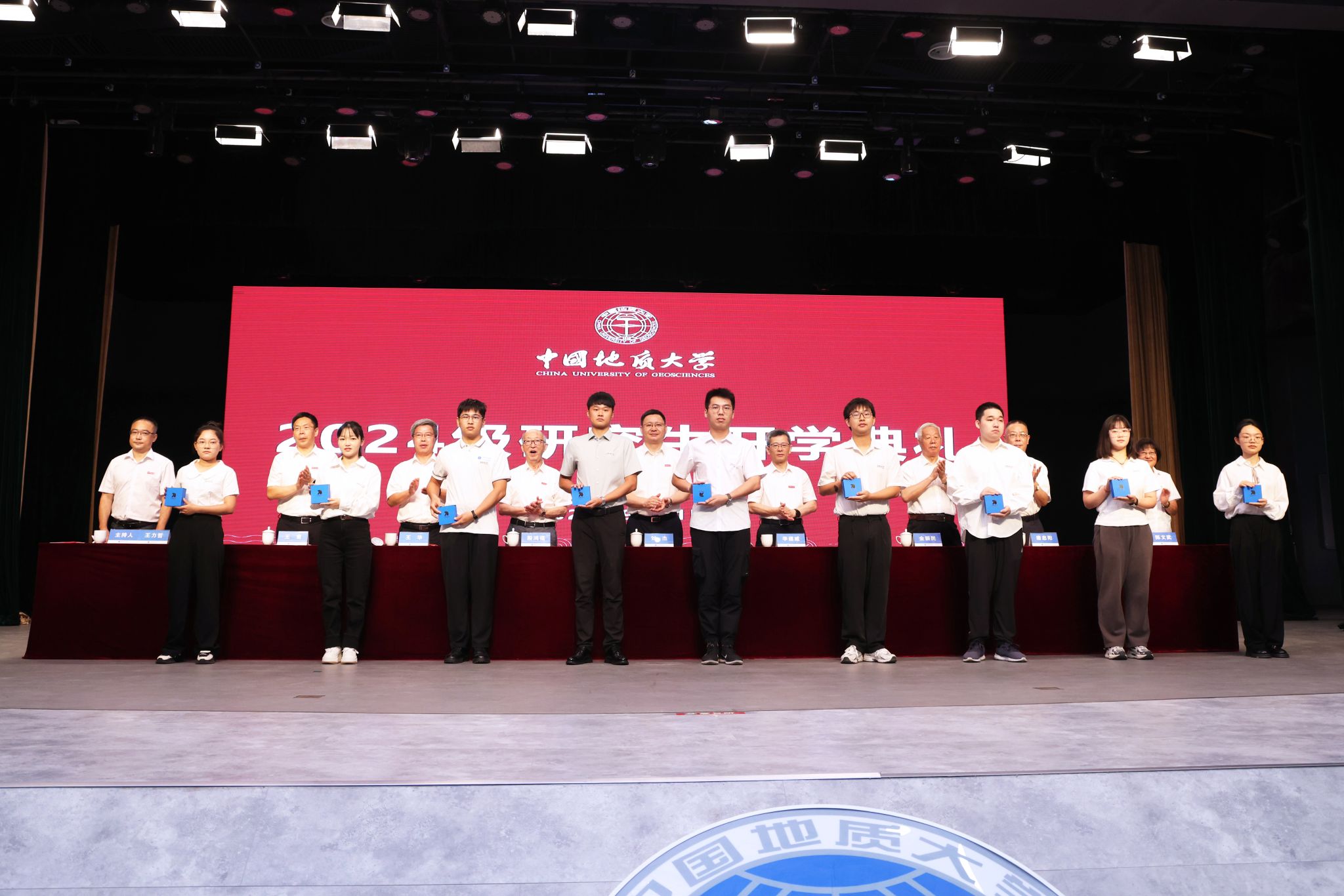 與會(huì)校領(lǐng)導(dǎo)、院士為2024級研究生新生代表贈(zèng)送校徽校標(biāo)。