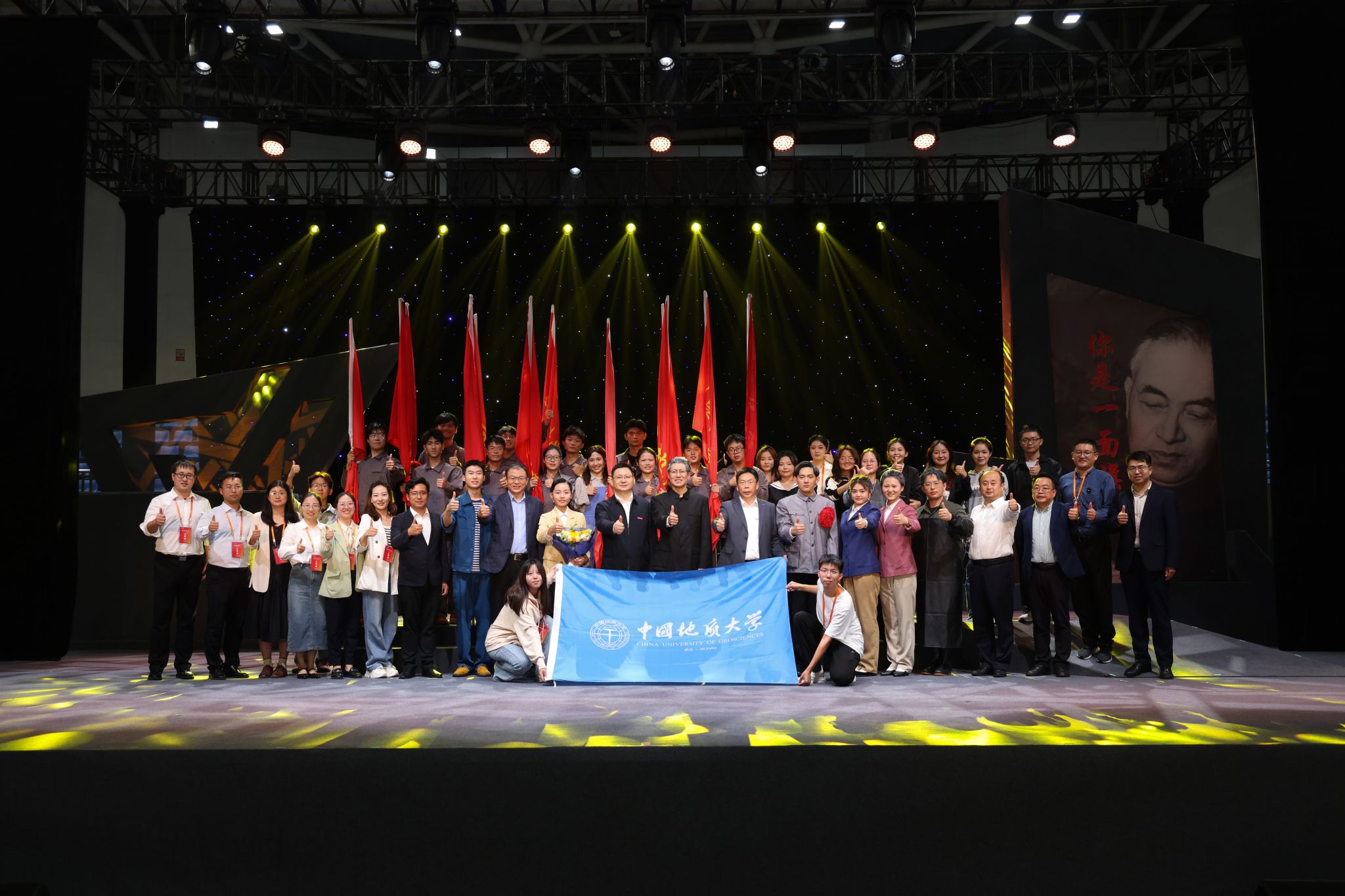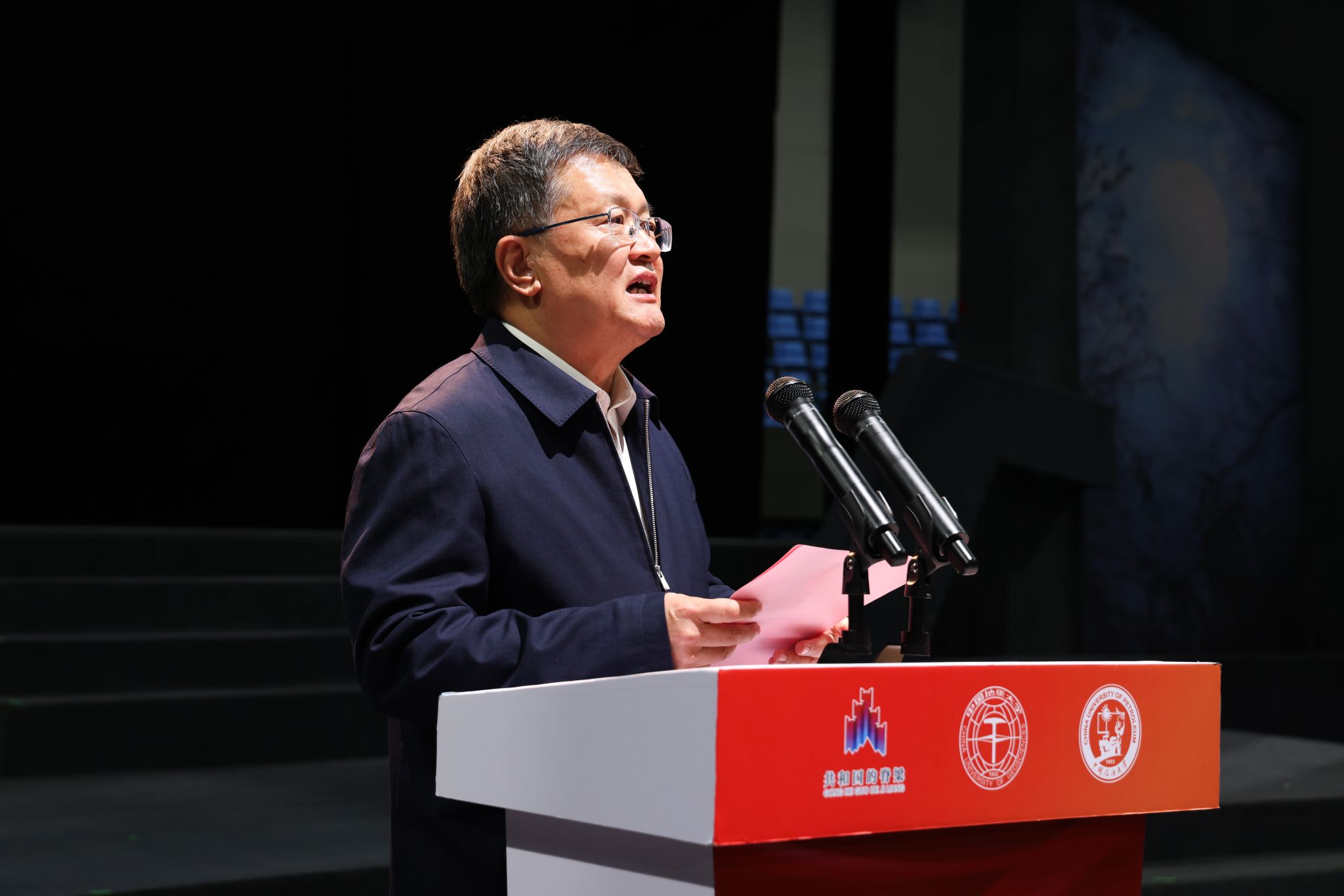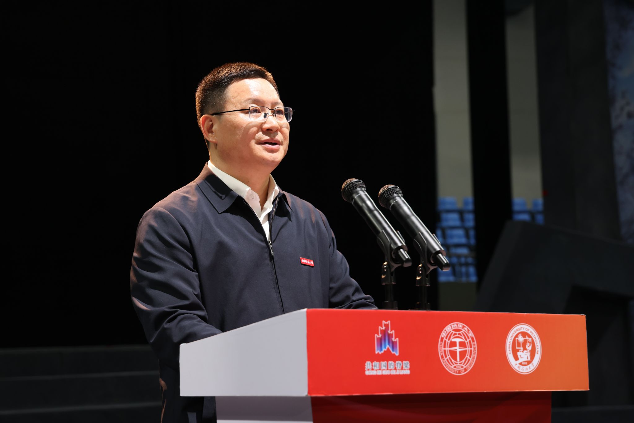 劉杰致辭并介紹話劇《大地之光》及李四光先生與地大的淵源。他講到,李四光先生是中國地質(zhì)大學(xué)的主要締造者,話劇《大地之光》選取李四光先生1950年回國后21年間,具有典型意義和矛盾沖突的歷史場景和故事,表現(xiàn)出先生的鮮明個性、科學(xué)人生和家國情懷。自2012年11月登臺首演以來,在全國巡演60余場,直接輻射觀眾10萬余人次,已經(jīng)成為中國地質(zhì)大學(xué)、中國科學(xué)家故事劇目的一張靚麗名片。他表示,在以李四光先生為代表的老一輩地質(zhì)科學(xué)家的指導(dǎo)和感召下,地大始終與黨和國家同心同向同行,建起了新中國最早的地質(zhì)高等教育體系,培養(yǎng)出以47位兩院院士為代表的30余萬名高級人才,為解決國家和人類社會面臨的資源環(huán)境問題提供高水平的人才和科技支撐。他指出,中國石油大學(xué)和中國地質(zhì)大學(xué)是同屬學(xué)科特色型大學(xué)的兄弟高校,有著相似的辦學(xué)發(fā)展歷程,相通的價值追求,在長期密切合作中結(jié)下深厚的友誼,希望此次演出為兩校攜手奮進教育強國建設(shè)新征程,扎根中國大地創(chuàng)建世界一流大學(xué)注入新的動力。