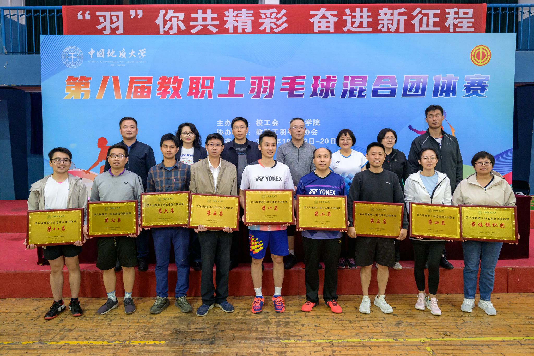 經過兩天激烈角逐,體育學院分工會獲得冠軍,圖書檔案與文博部分工會獲得亞軍,機關分工會、經濟管理學院分工會、外國語學院分工會、地球科學學院分工會、資源學院分工會、自動化學院分工會分別獲得第三名至第八名,醫院分工會獲得最佳組織獎。唐忠陽、王甫、陳文武、體育學院黨委書記龐嵐及校工會常務副主席郭秀蓉參加閉幕式并為獲獎分工會頒獎。