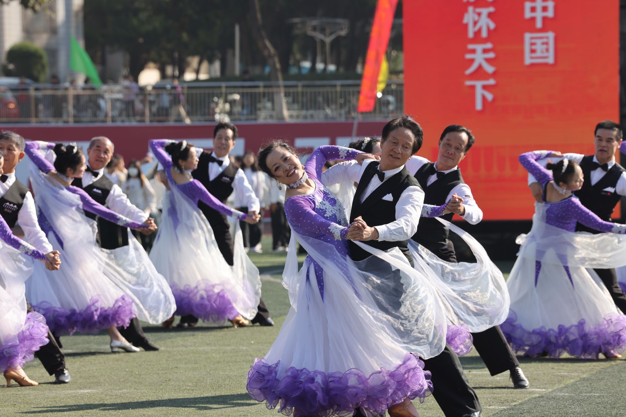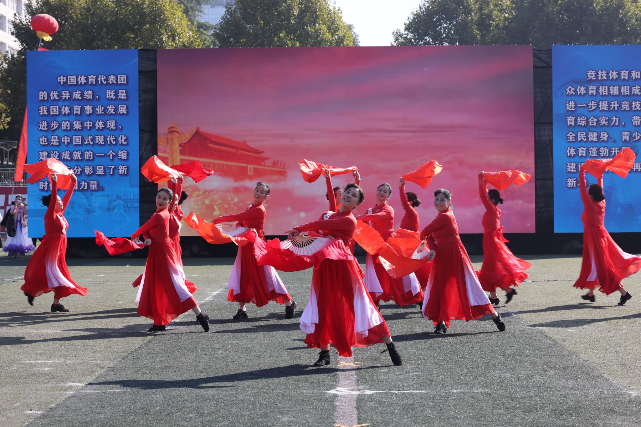 離退休工作處精心組織老同志編排舞蹈《五星紅旗》,深情告白祖國,他們手舉紅扇,身著紅裙,歌唱祖國,用精湛的舞技和深情的表演,讓師生們感受到五星紅旗的魅力與力量。