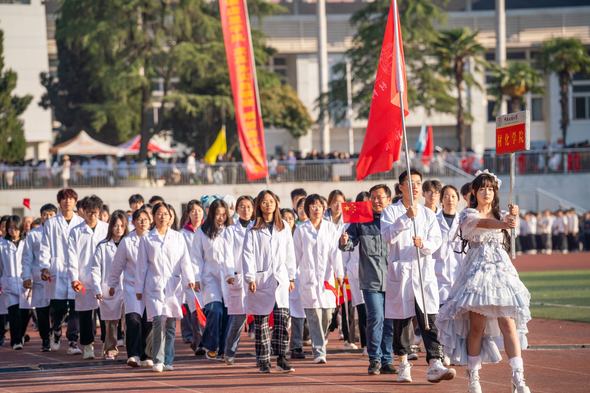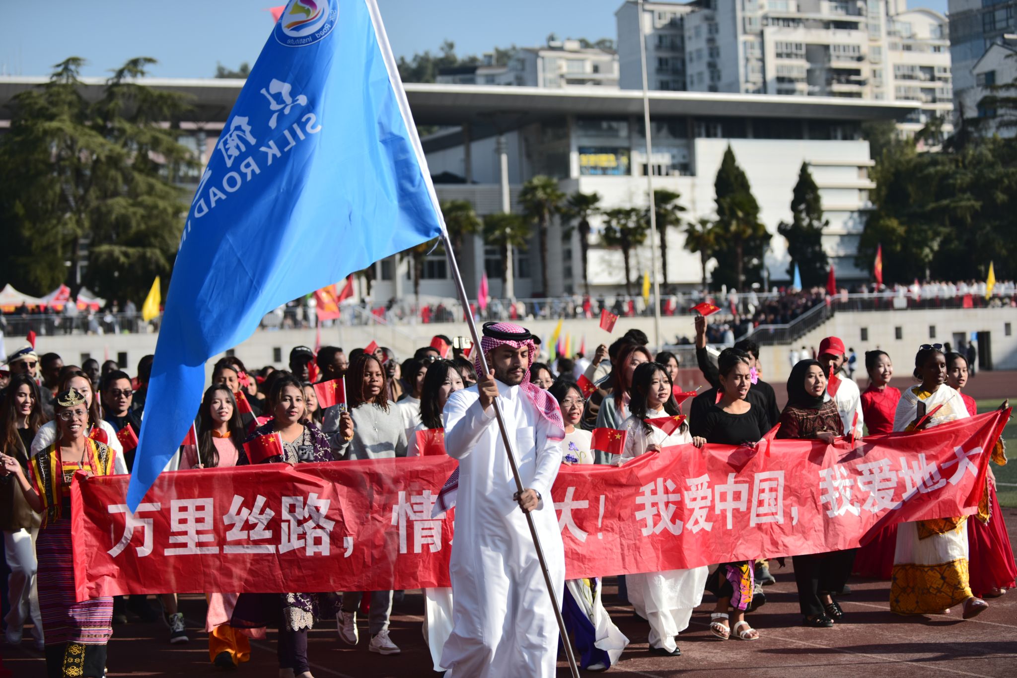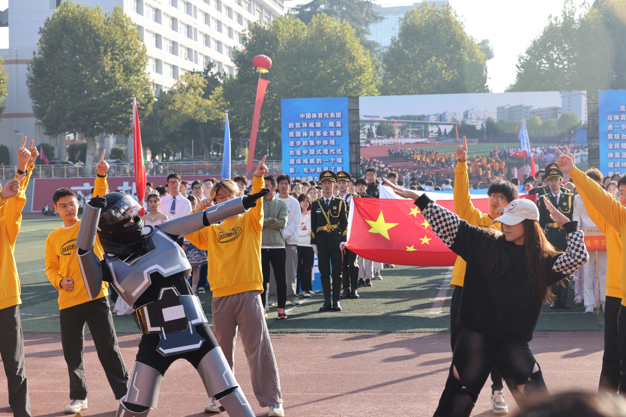 機械與電子信息學院方陣一支機械舞,將學院的學科特色與舞蹈藝術巧妙融合,展現出了獨特的魅力;體育學院帶來一套拳法,剛柔相濟,行云流水,弘揚博大精深的中國武術;國際教育學院的外國友人身著各自國家的特色服飾,大聲喊出“我愛地大”,傳遞出國際文化交流的友好與融合。