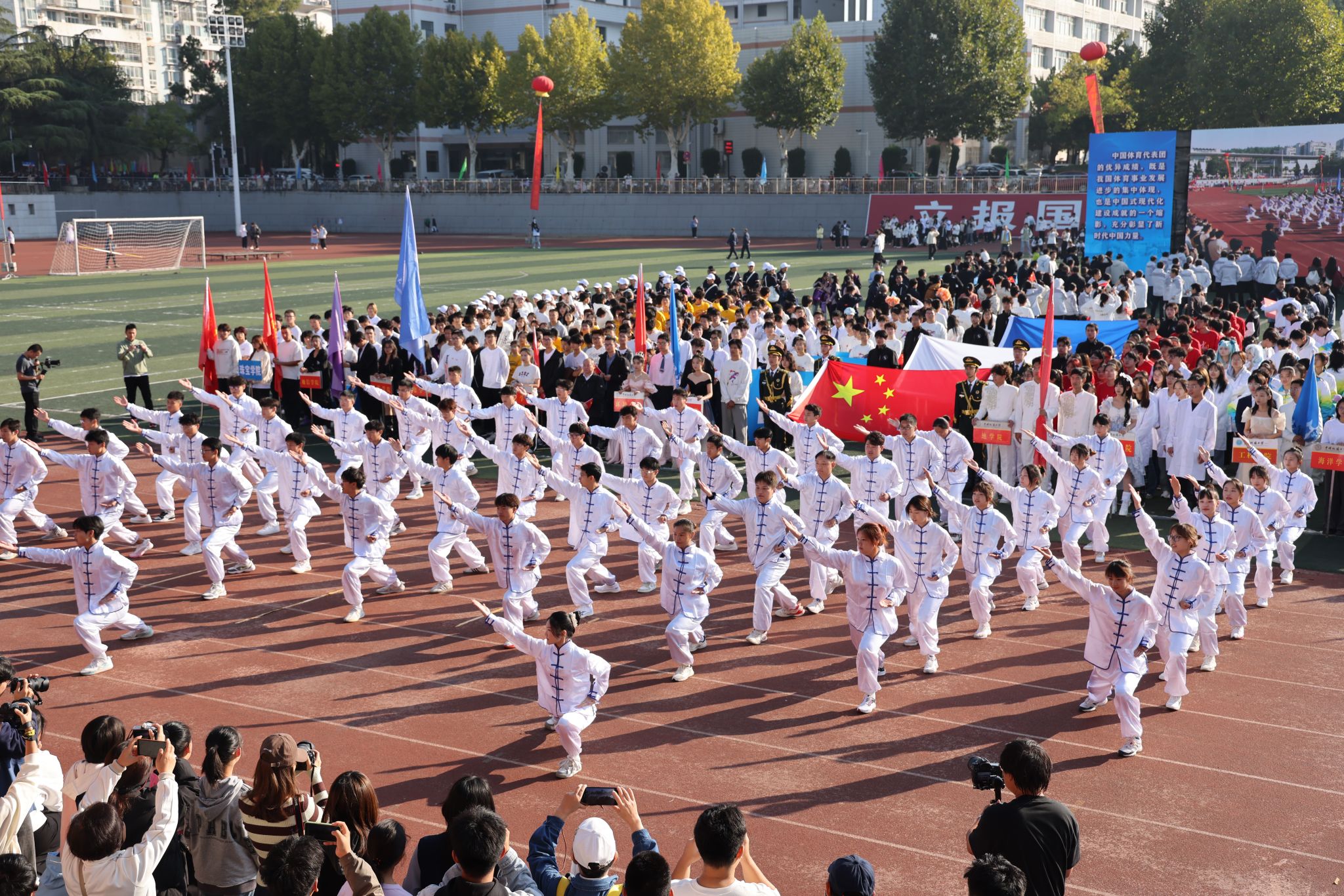 來自22個院系、校工會太極拳協會以及5個職能部門300余名師生帶來《師生同練八段錦》。“增強文化自信自強,鑄就社會主義新輝煌。”以獨特的方式展現了文化與健康的緊密結合,為校園生活注入了新的活力,樹立“健康第一”的指導思想,增強師生體質,增進師生之間的情感交流,營造出積極向上、團結和諧的校園氛圍。