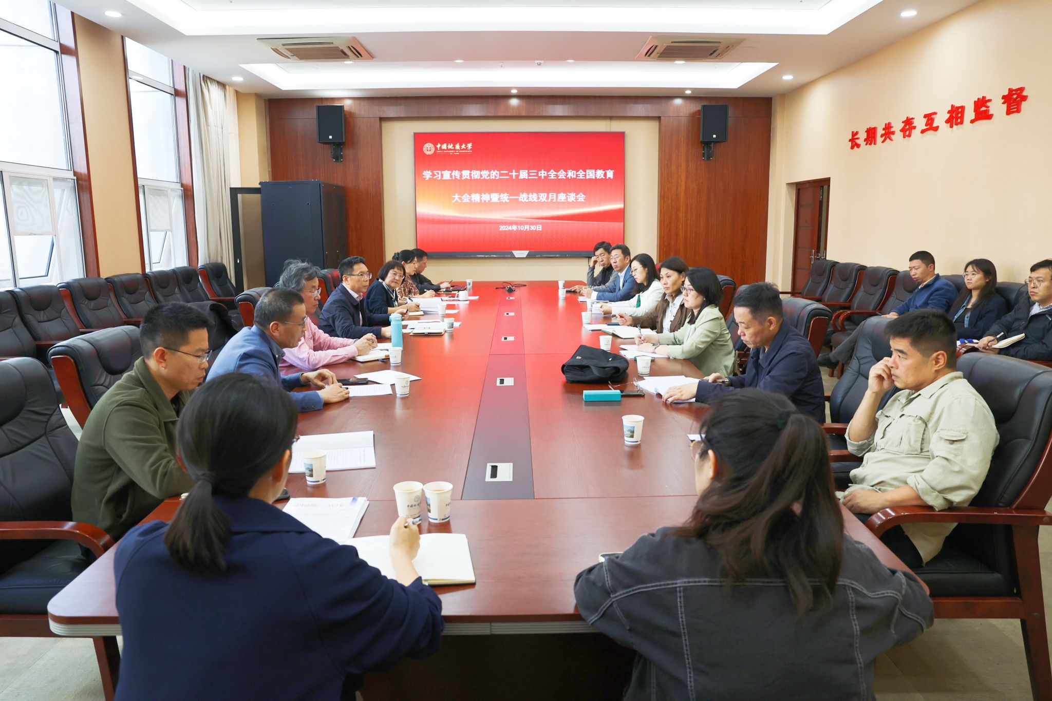 地大新聞網訊(通訊員 王艷平)10月30日,我校召開學習宣傳貫徹黨的二十屆三中全會和全國教育大會精神暨統一戰線2024年度第3期雙月座談會。校黨委副書記王甫,黨委常委、組織部部長、統戰部部長陳文武,我校現任黨外人大代表、政協委員、政府參事,各民主黨派基層組織、統戰工作團體主要負責人及骨干成員、相關管理服務機構負責人應邀參會。會議由黨委統戰部副部長曾希主持。