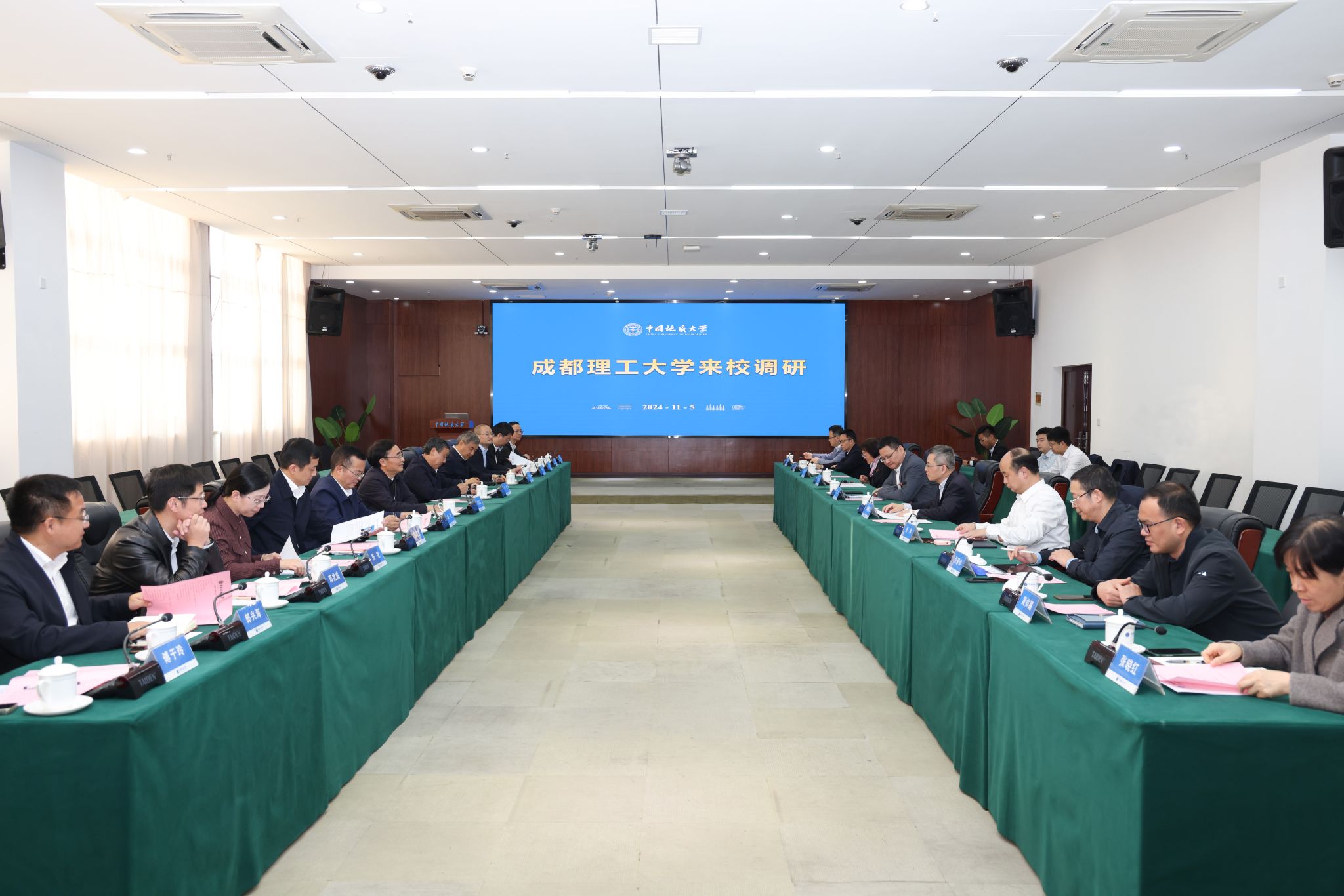 地大新聞網(wǎng)訊(記者 焦思勤)11月5日,成都理工大學(xué)來校調(diào)研。該校黨委書記劉清友、校長許強(qiáng)、黨委副書記胡兵,副校長巨能攀,黨委常委、組織部部長陳科先,我校黨委書記劉杰,校長李建威,黨委常委、組織部部長陳文武及雙方相關(guān)單位負(fù)責(zé)人參加會議。