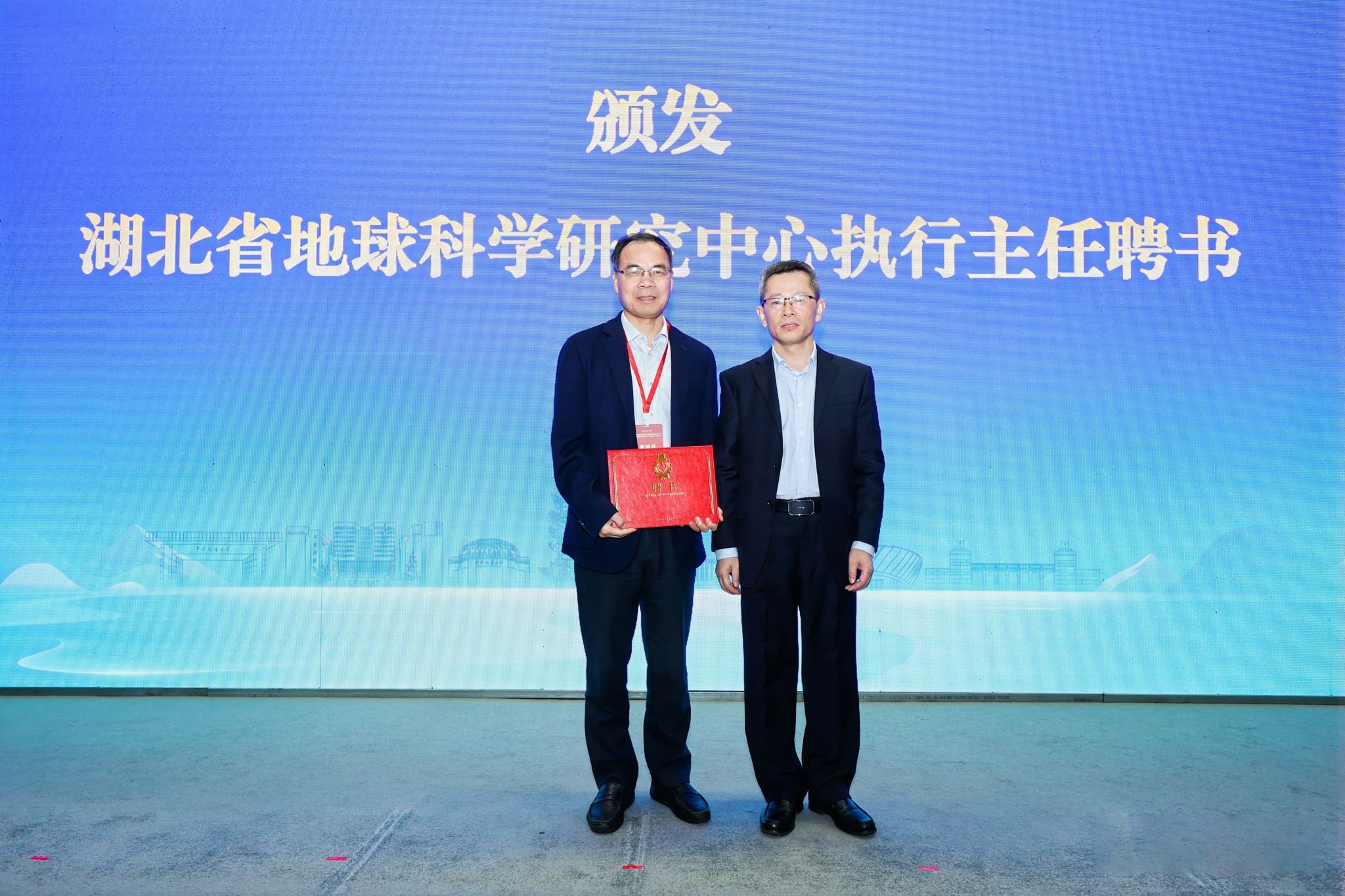李建威為湖北省地球科學基礎學科研究中心執行主任謝樹成院士頒發聘書。