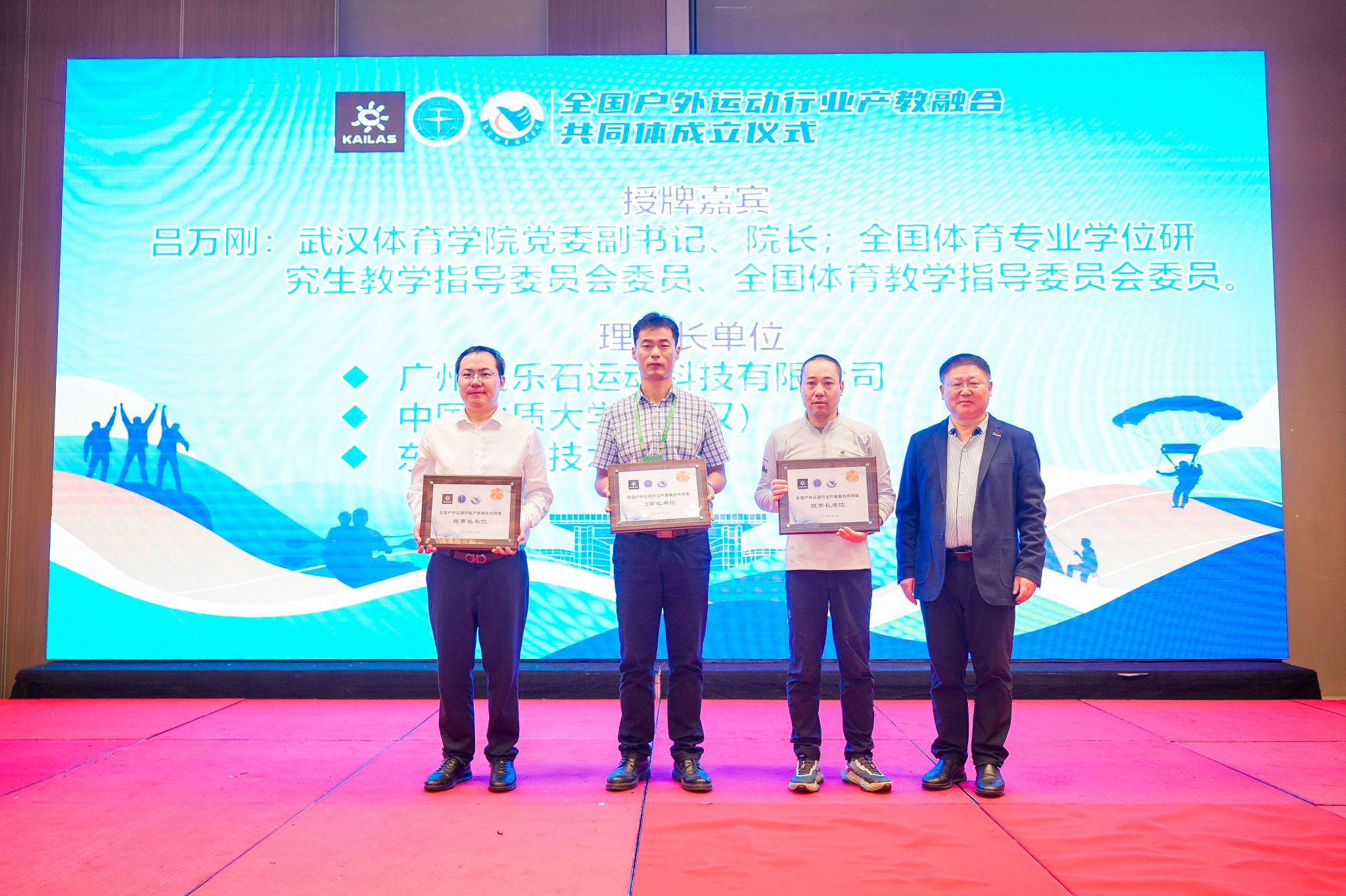 大會審議并通過了《全國戶外運動行業產教融合共同體章程》,并舉啟動儀式。武漢體育學院黨委副書記、校長呂萬剛對理事長單位,北京師范大學教授張瑞林對特邀理事長單位,汕頭大學副校長喻洪、東莞職業技術學院校長賀定修等對副理事長單位進行授牌。