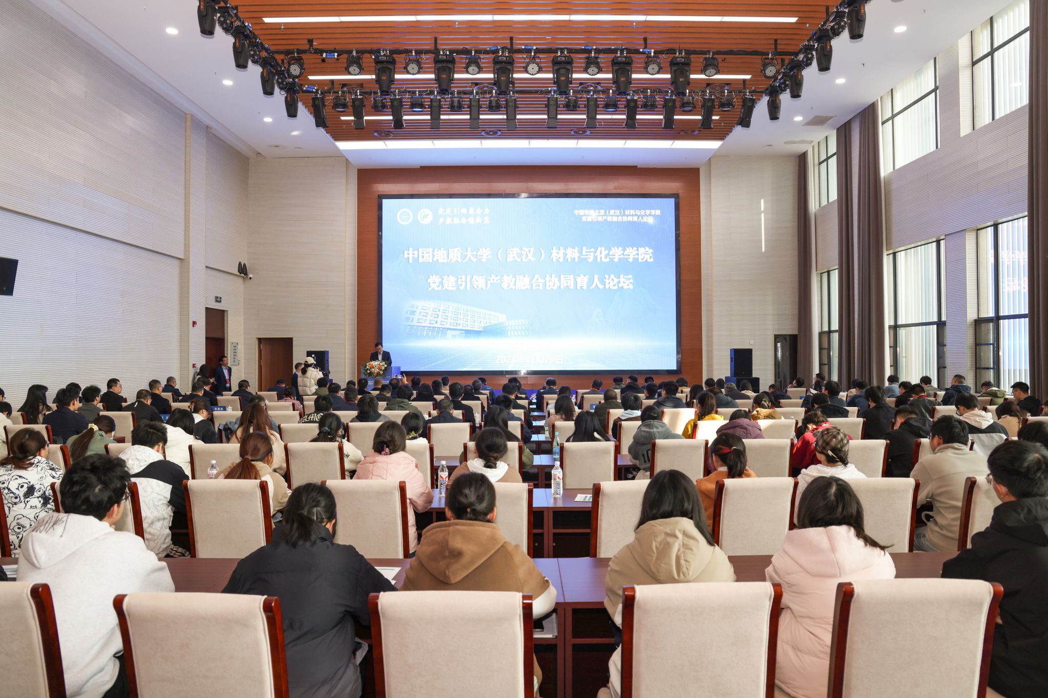 武漢未來科技城、鄂州市華容區、隨州市高新區、宜興市丁蜀鎮等4家政府代表,中國原子能科學研究院、華中科技大學、華中農業大學、中國地質大學(北京)、鄭州大學、深圳大學、武漢科技大學、湖北大學等14家科研院所及高校化學與材料相關學院負責人,比亞迪、TCL華星光電、嵐圖汽車、天馬微電子、盛和資源、新綸新材等24家企事業單位代表,我校相關職能部門負責人、材料與化學學院全體二三級班子成員、師生代表等參加論壇。